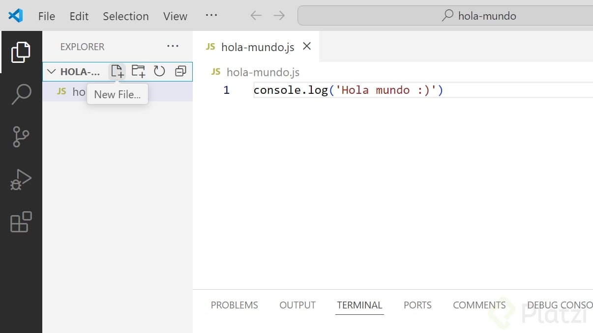 - Con la carpeta abierta en Visual Studio Code, crea un nuevo archivo llamado "holaMundo.js".
