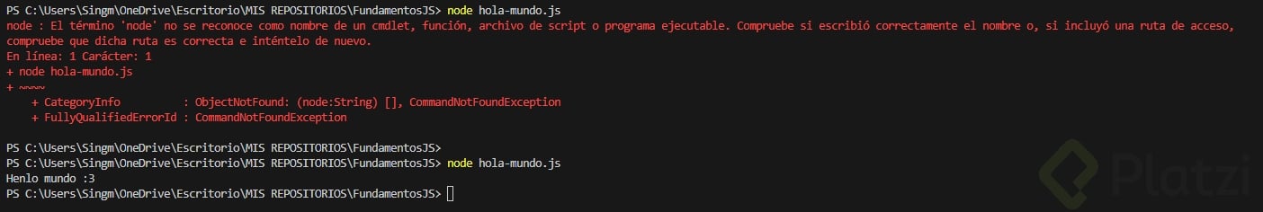node holaMundo.jsy presiona enter. - Deberías ver el mensaje "Hola Mundo Feliz 😊" impreso en la terminal, confirmando que tu script se ejecutó correctamente.