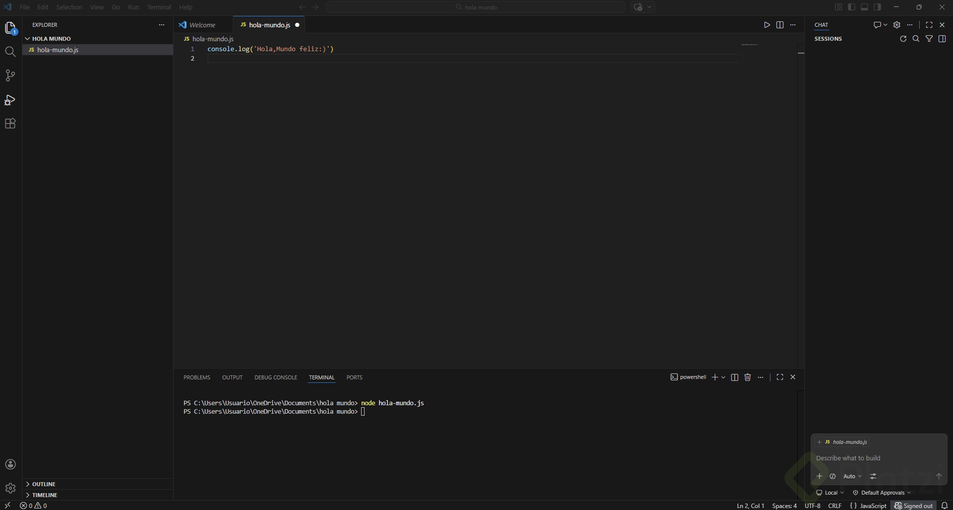 Con las herramientas instaladas, es momento de escribir el primer programa. En Visual Studio Code se crea un archivo con extensión .js (por ejemplo, holamundo.js). Dentro de ese archivo se utiliza la instrucción console.log(), que es el método estándar en JavaScript para imprimir mensajes en la terminal [3:10].