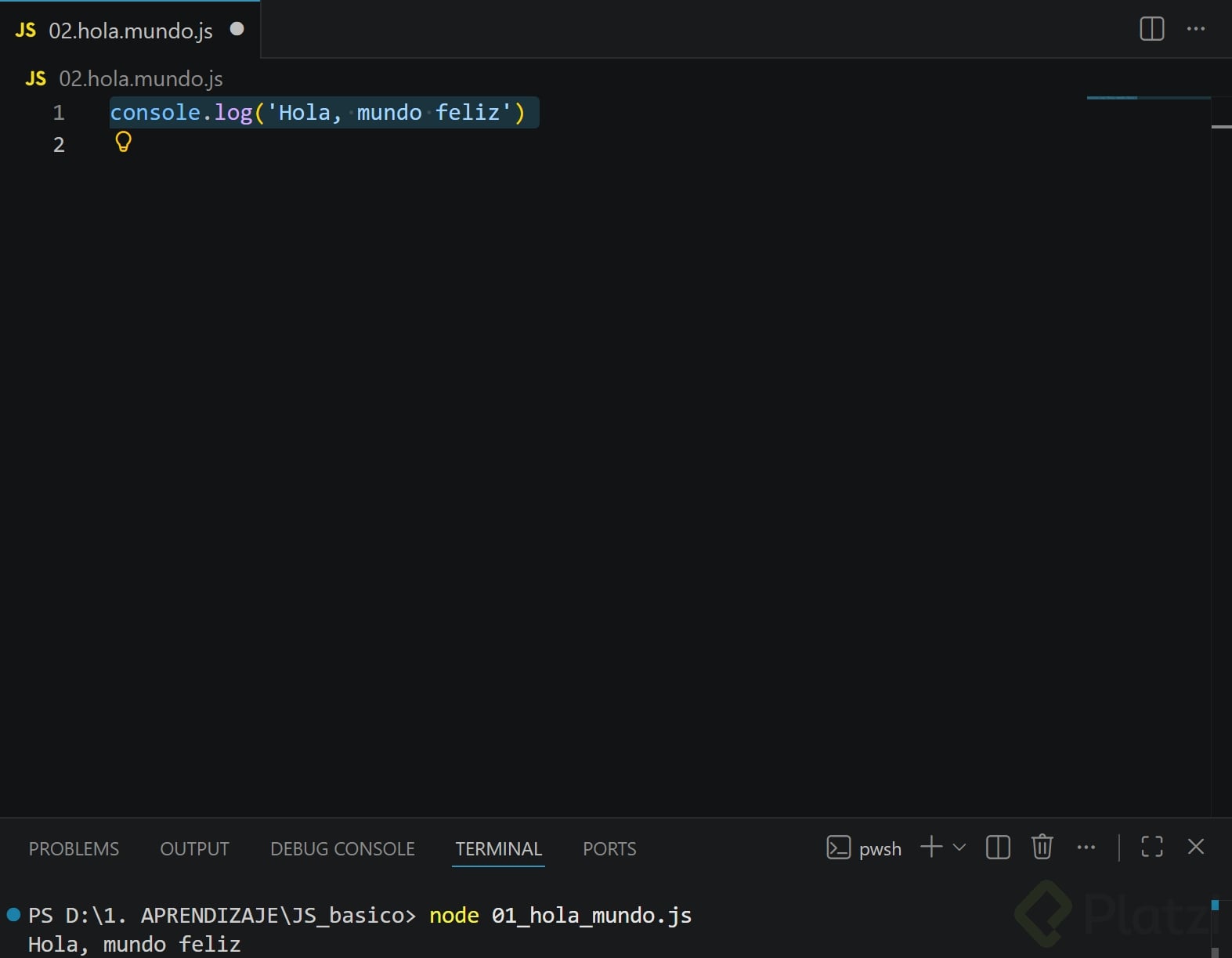 Al presionar Enter, la terminal imprime el mensaje "Hola mundo feliz" [3:50]. Ese resultado confirma que tanto Visual Studio Code como Node.js funcionan correctamente y que el código JavaScript se ejecutó con éxito.