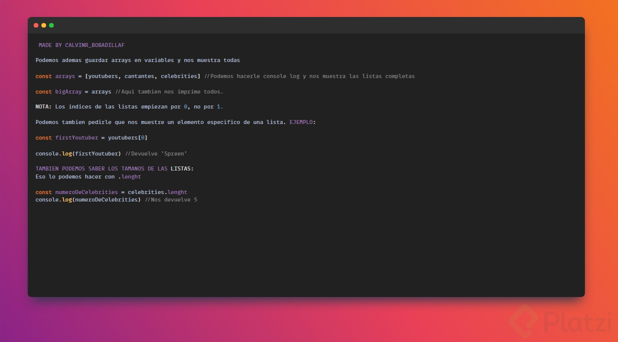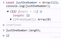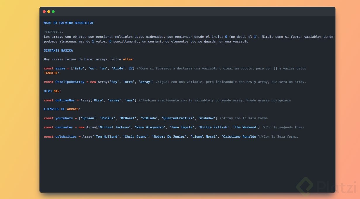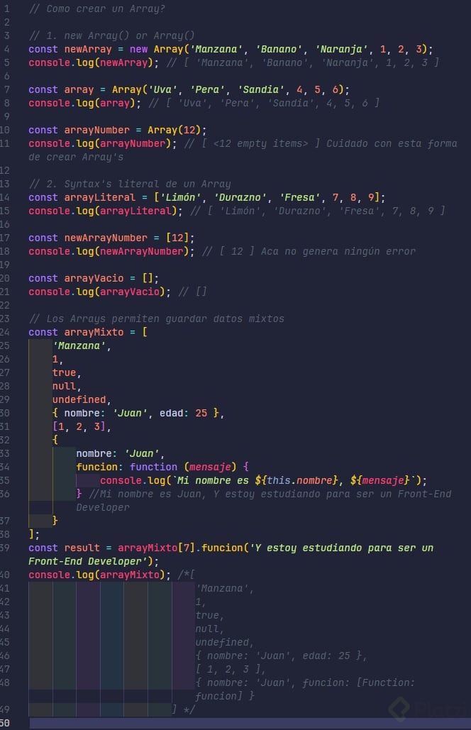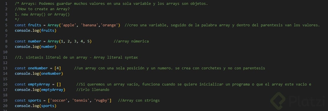 new Array(): Este enfoque requiere el uso de la palabra clavenewseguida deArray(). Aunque es menos común, verás este método en proyectos más antiguos.const fruits = new Array('apple', 'banana', 'orange'); console.log(fruits); -
