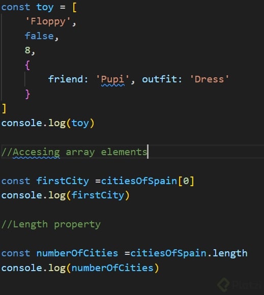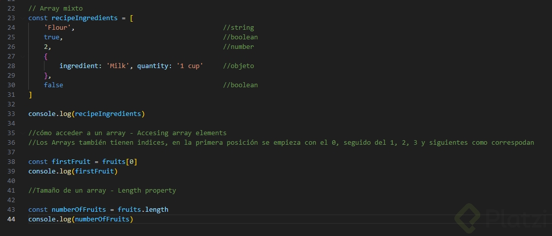 []para definir los elementos del array.const fruits = ['apple', 'banana', 'orange']; console.log(fruits);