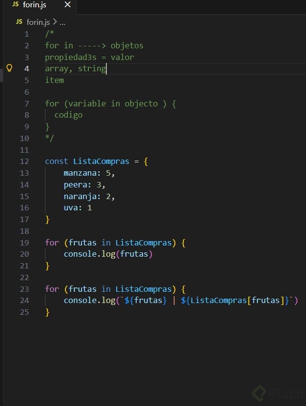 for (let fruta in listaDeCompras) {