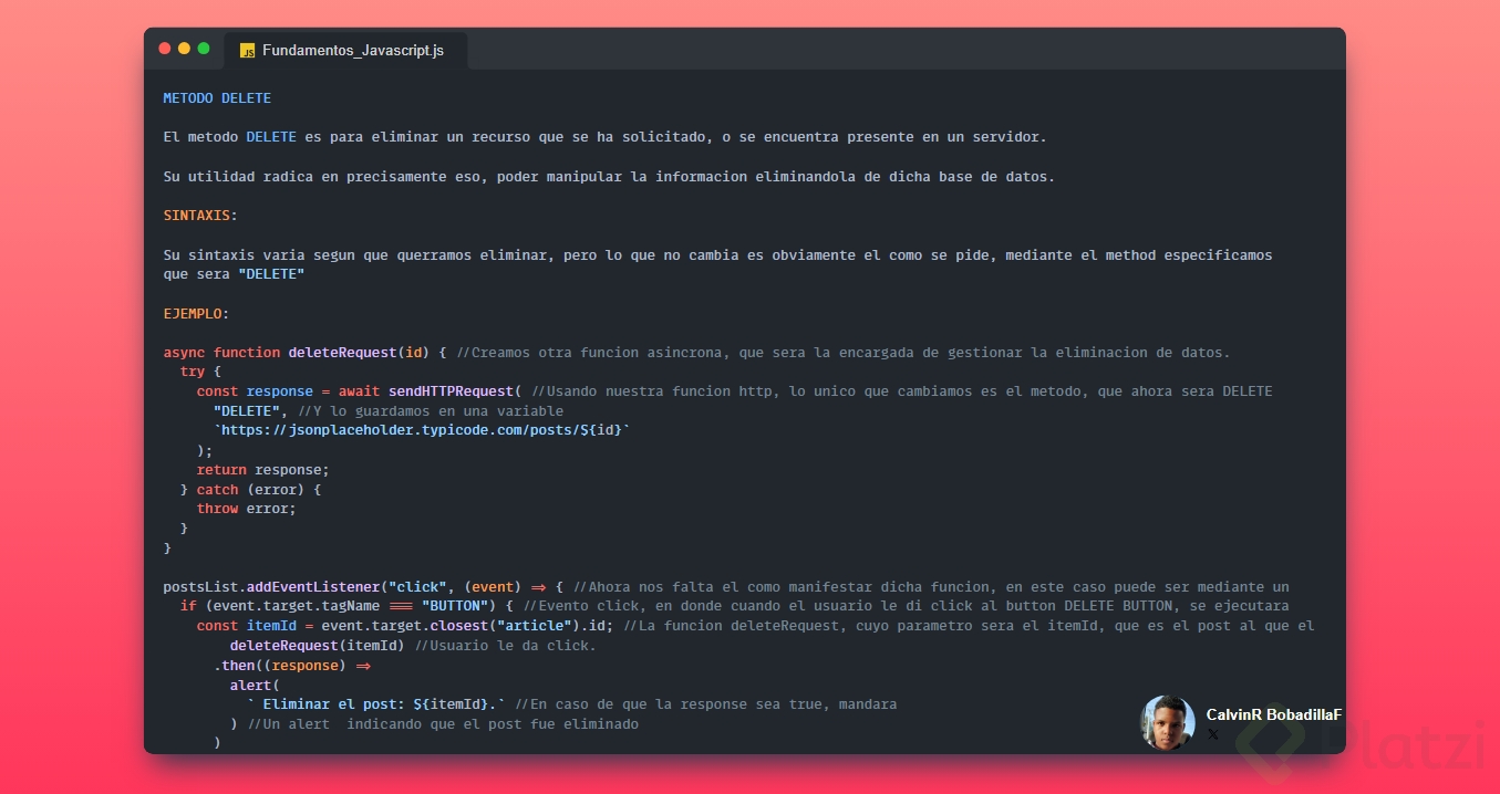 Una vez tenemos el ID del elemento, podemos enviar una solicitud DELETE al servidor. Las solicitudes DELETE con frecuencia requieren que especifiquemos el recurso que deseamos borrar adjuntando su ID en la URL: