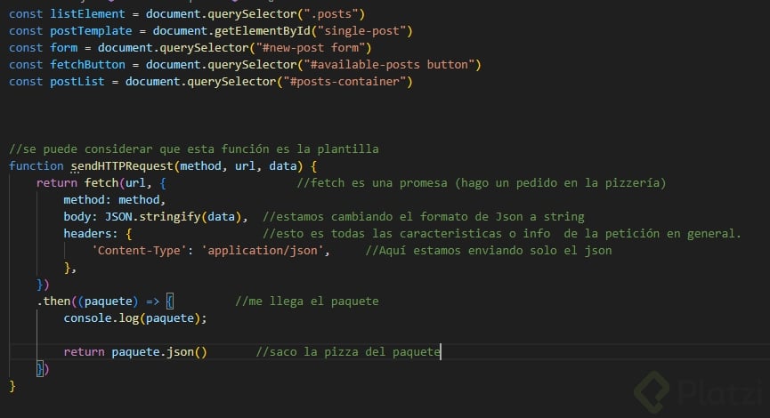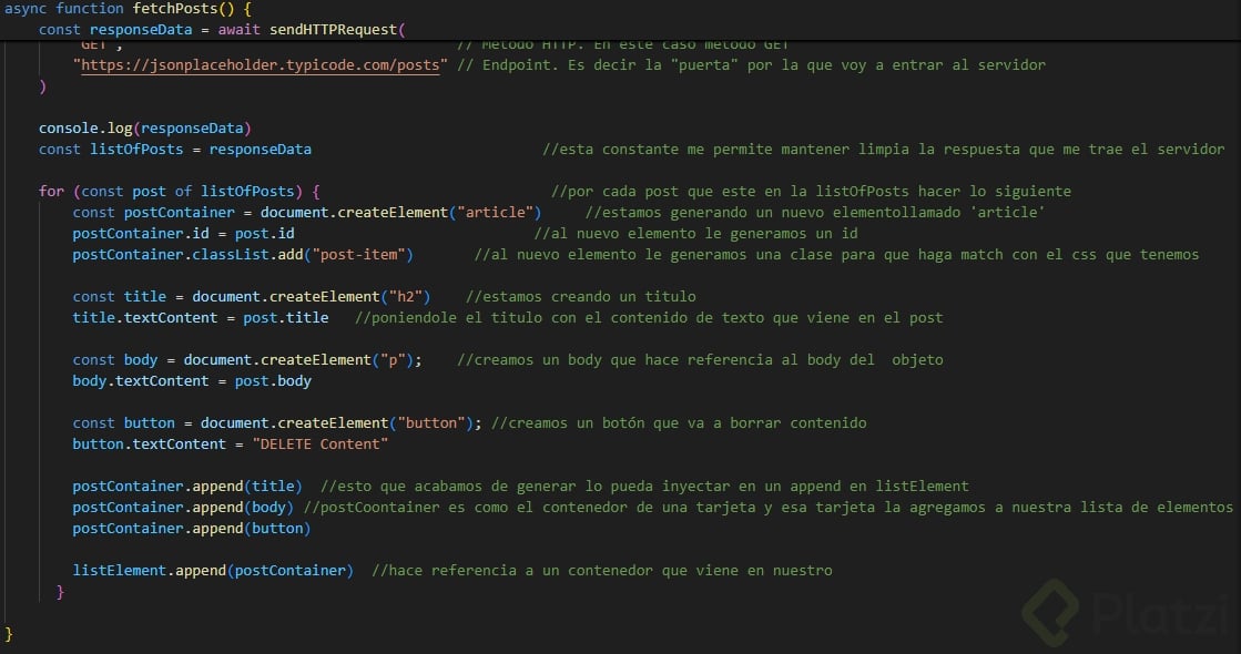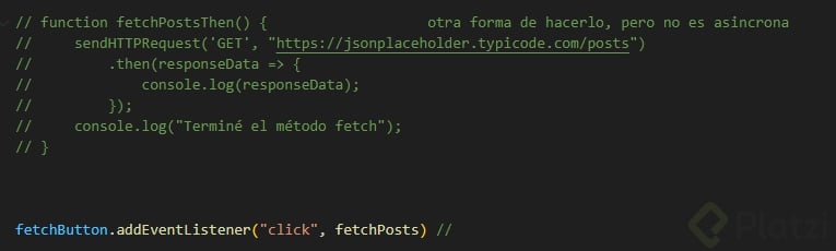 La función fetchPost es la encargada de hacer uso de sendHttpRequest para realizar una petición GET que recuperará posts de una URL específica.