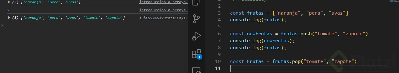 Al ejecutar el código, notarás que el array frutas ahora incluye watermelon. Este método ha modificado directamente el array original.