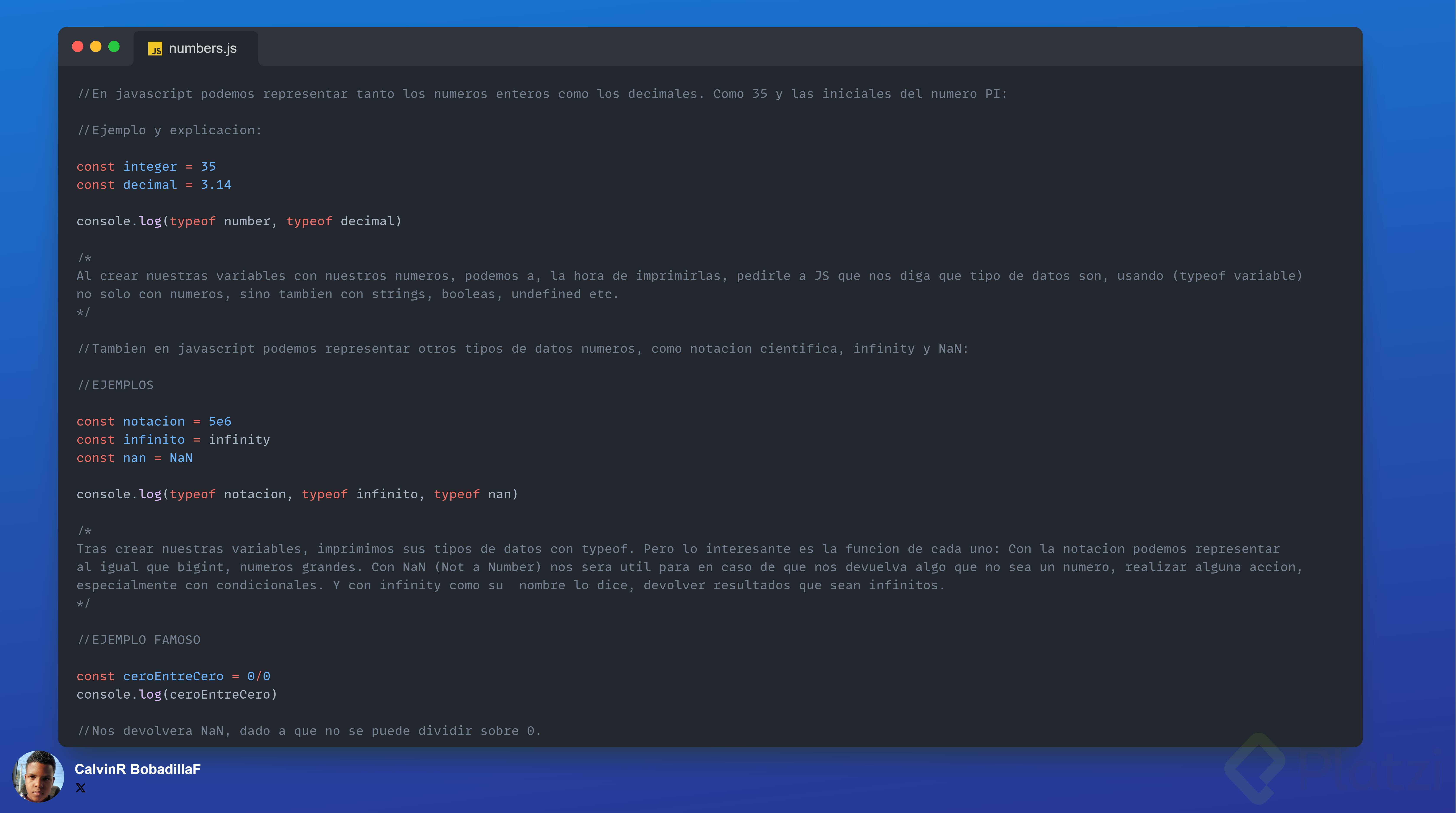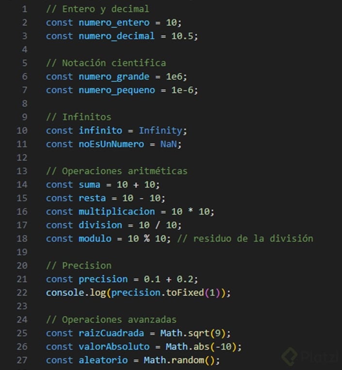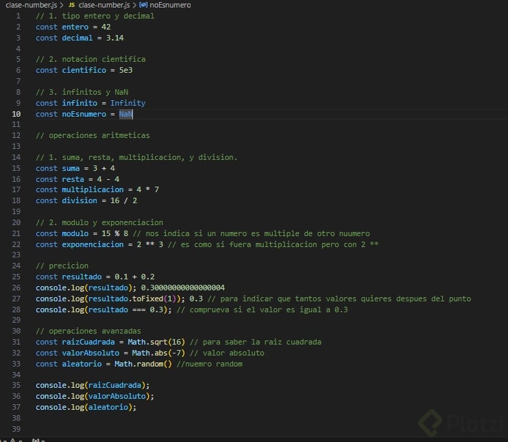 Infinity, mientras que un cálculo o valor indefinido se representa comoNaN(Not a Number).let infinito = Infinity; let noNumero = NaN;