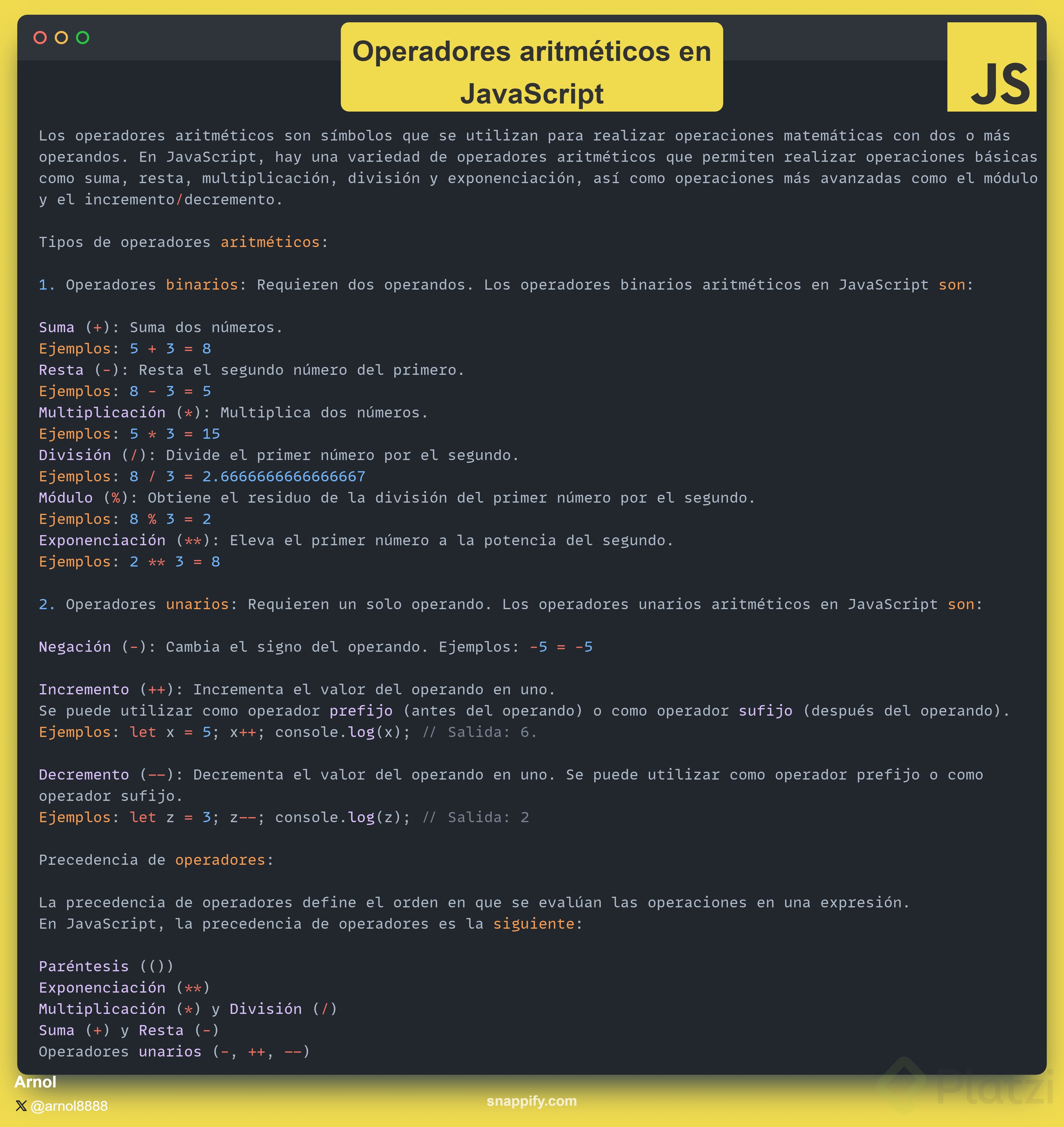 JavaScript proporciona operadores aritméticos para realizar cálculos básicos y avanzados. Entre ellos destacan: