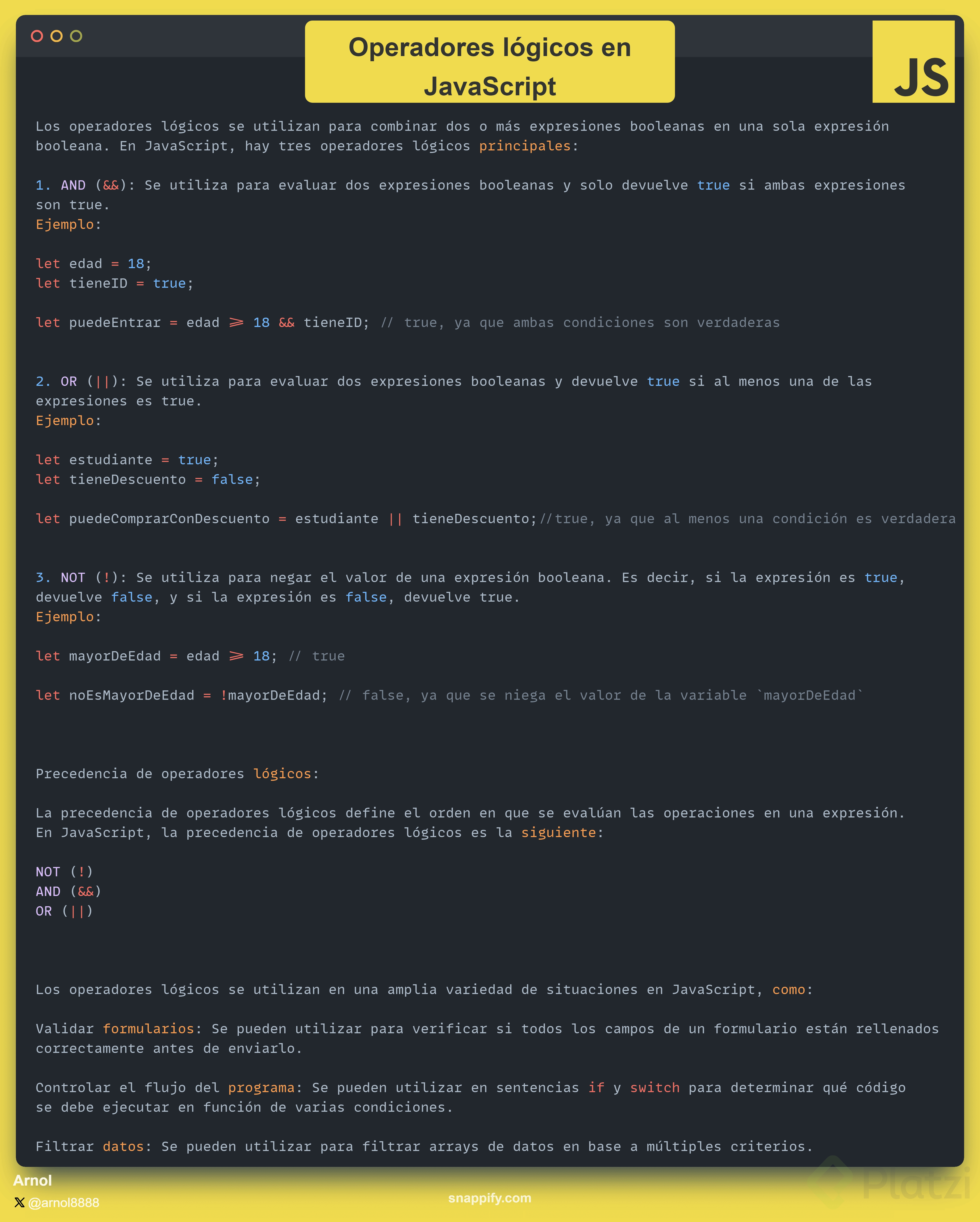 El operador NOT (no) resulta muy útil cuando queremos invertir el resultado de una evaluación. Si aplicamos NOT a una condición, convertimos true en false y viceversa.