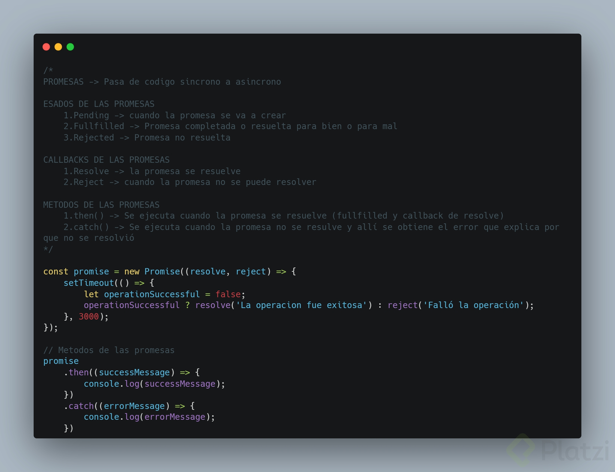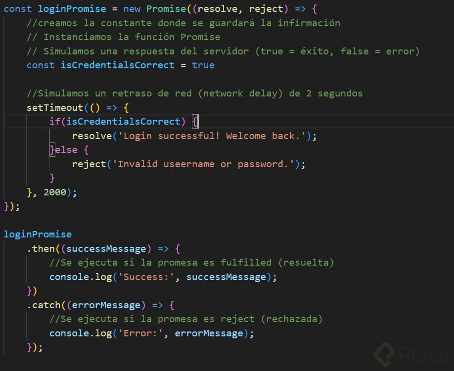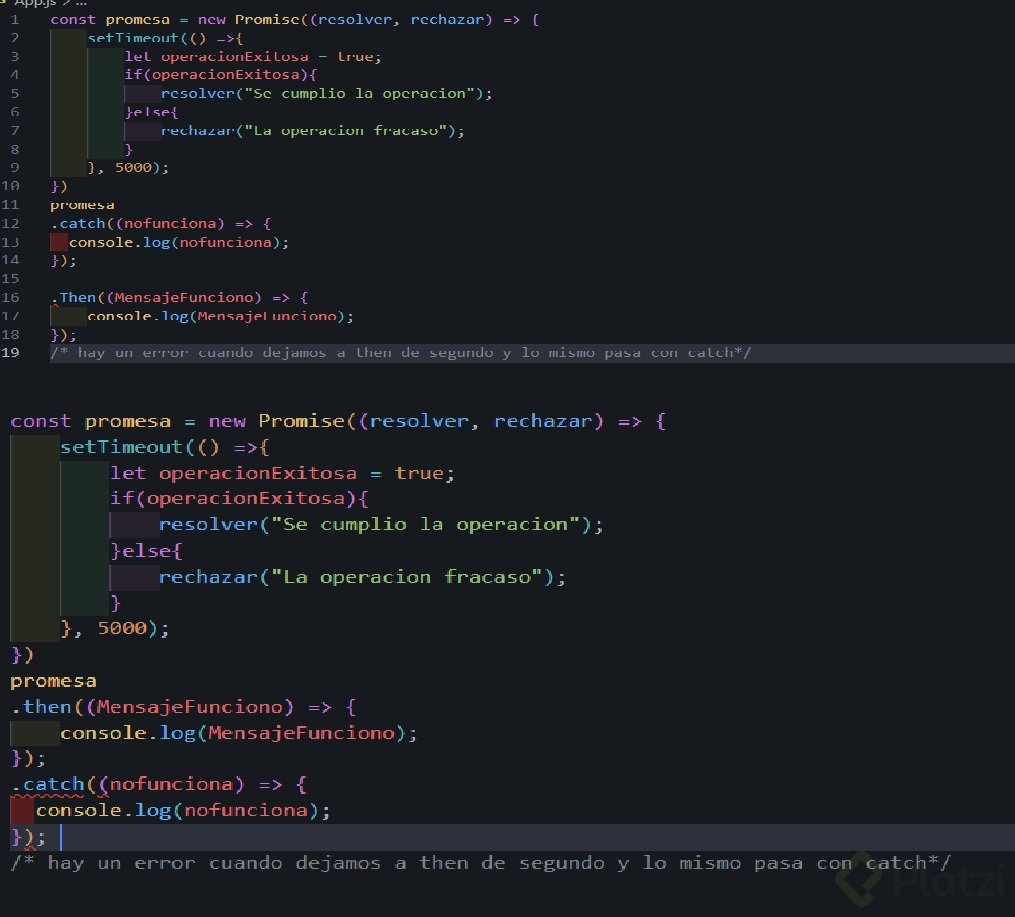 - Catch: Se utiliza para manejar errores. Si la promesa falla, el