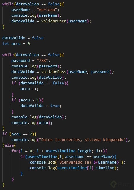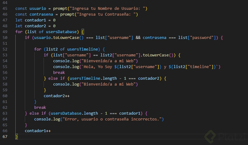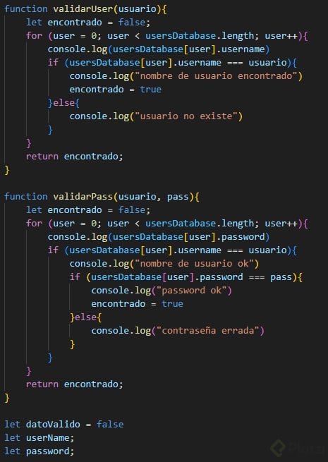 La función usuarioExistente utiliza un bucle que itera sobre cada objeto de nuestro userDatabase, y verifica si la información se corresponde con el input del usuario.