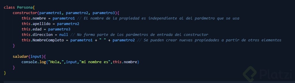 En este ejemplo, this.nombre y this.edad indican que cada instancia de Persona tendrá propiedades nombre y edad, cuyas valores serán los que se pasen al crear las instancias.