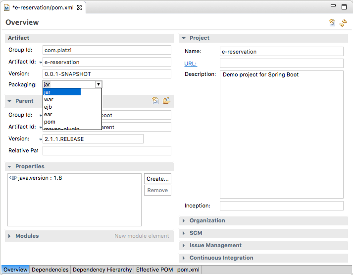 La estructura de nuestra aplicación parte de un paquete base llamado com.platzi.ereservation que hemos creado gracias a la herramienta de construcción y lo hemos cargado al Spring Tool Suite. Ahora, vamos configurar los paquetes para las capas de modelo, negocio y vista. Recuerda que puedes utilizar la sección de Package Explorer, seleccionar nuestro paquete base, utilizar el atajo Ctrl + N, seleccionar la opción Package y automáticamente vamos a generar el nombre del paquete que podemos modificar según nuestras necesidades (en nuestro caso, los paquetes son com.platzi.ereservation.modelo, com.platzi.ereservation.repository, com.platzi.ereservation.resources, com.platzi.ereservation.services).