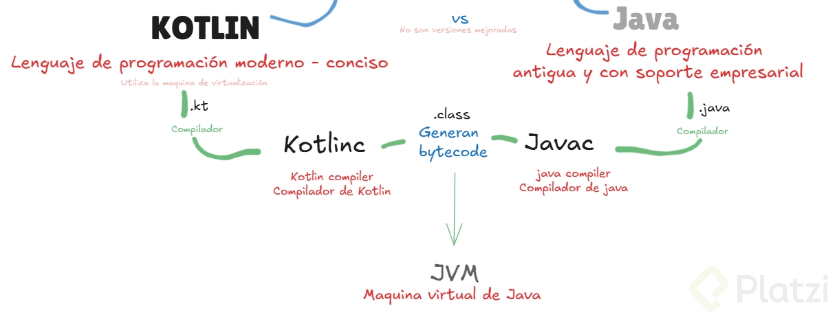 En palabras más simples, nosotros ingresamos código de Kotlin y se transforma en Bytecode. Este proceso puede ocurrir con otros lenguajes como Java, esto hace que nuestro código de Kotlin pueda ser utilizado desde Java y el código de Java pueda ser utilizado en Kotlin.