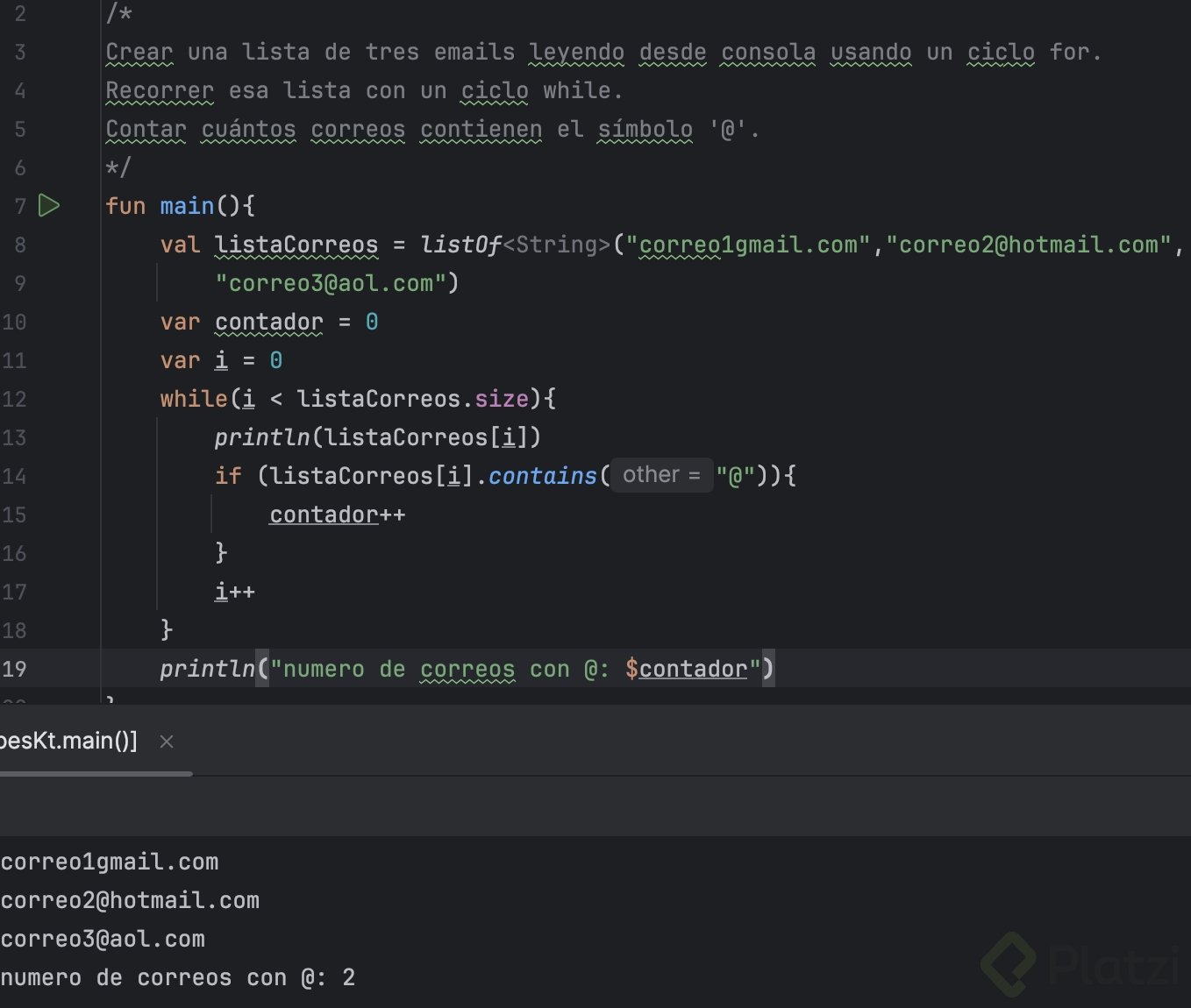 while. - Contar cuántos correos contienen el símbolo '@'.