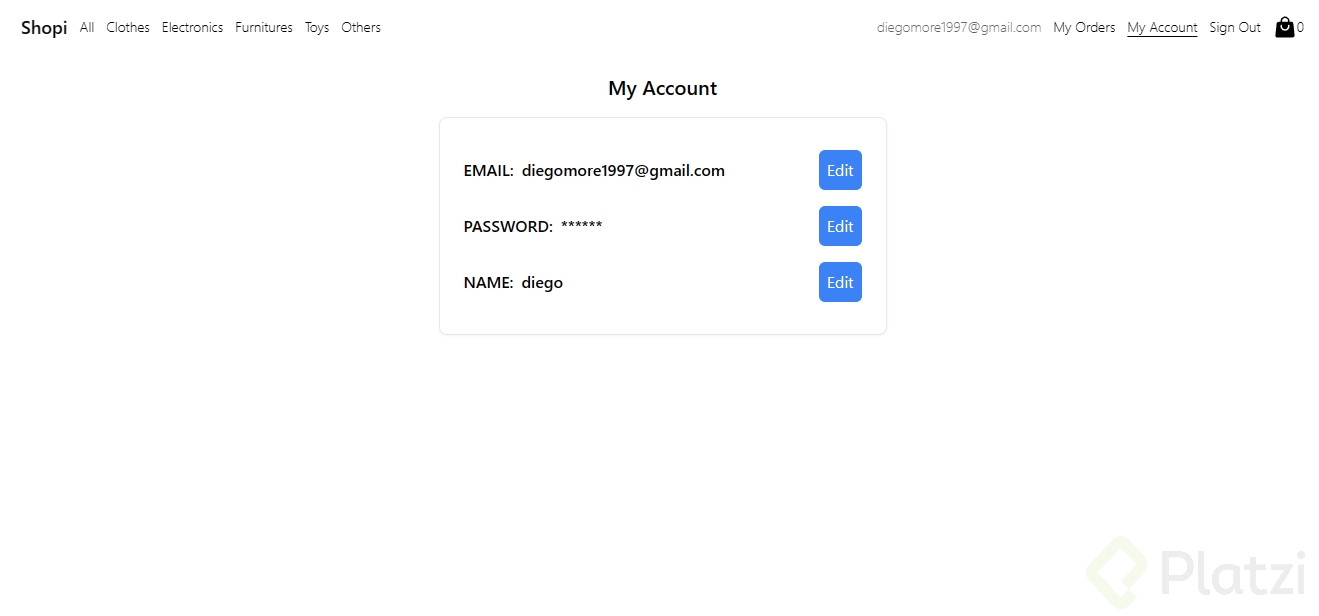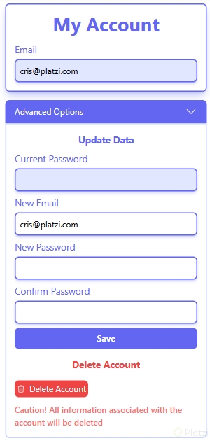 - Interacción de usuario: Implementa botones y acciones, como un botón de "Editar", que cuando se presiona, cambia la interfaz para mostrar un formulario de edición similar al utilizado al crear una cuenta.