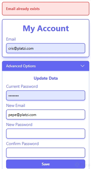 - Actualizar un correo "quemado": Cambia cualquier dato ficticio o estático, como un correo electrónico, para reflejar información real desde el almacenamiento de tus datos (a menudo localizado en el local storage).