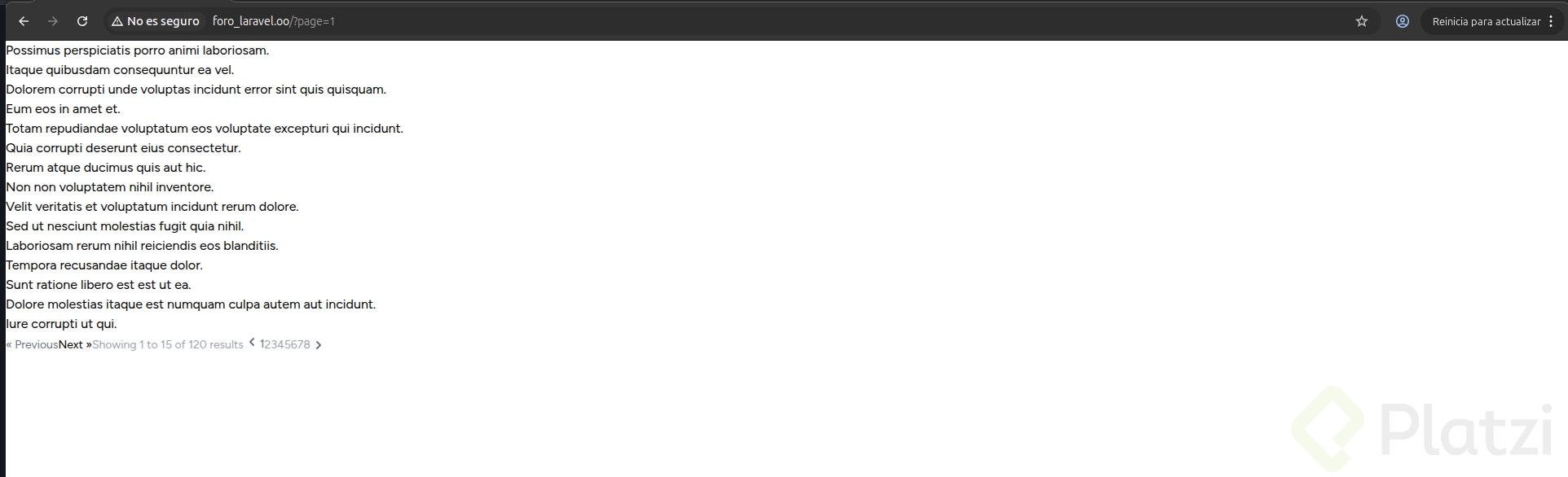 Para verificar que la estructura y la configuración sean correctas, accede a tu navegador y carga la página. Al ingresar, deberías ver los registros de tus datos paginados y al final, los controles para navegar entre páginas. Esto confirma que la aplicación está manipulando correctamente la base de datos y mostrando el contenido según lo esperado.