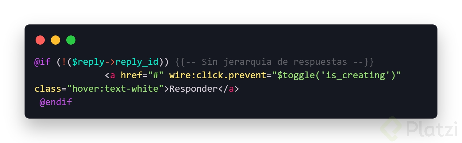 Controlar la jerarquía de respuestas: Implementa lógica que permita respuestas solo hasta un cierto nivel de profundidad. Esto se maneja comprobando si una respuesta ya tiene una respuesta padre antes de mostrar un nuevo formulario de respuesta.