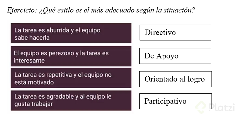 Let's bring theory to practice! Un excelente ejercicio es pensar en situaciones reales donde debas aplicar estos estilos. Por ejemplo: si diriges a un grupo de editores enfrentados a tareas repetitivas, pero que dominan, el estilo directivo podría ayudarte a maximizar su eficiencia.