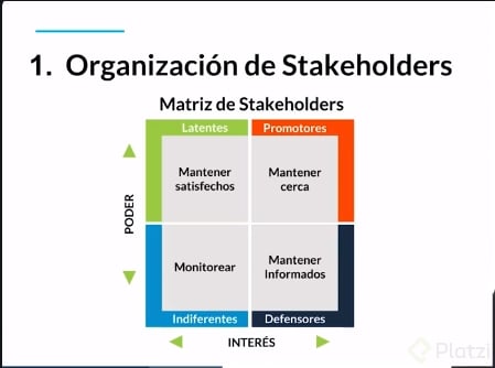 - Enlista e identifica los stakeholders en tu equipo. Tomar en cuenta el poder e interés que estos tengan sobre tu trabajo.
