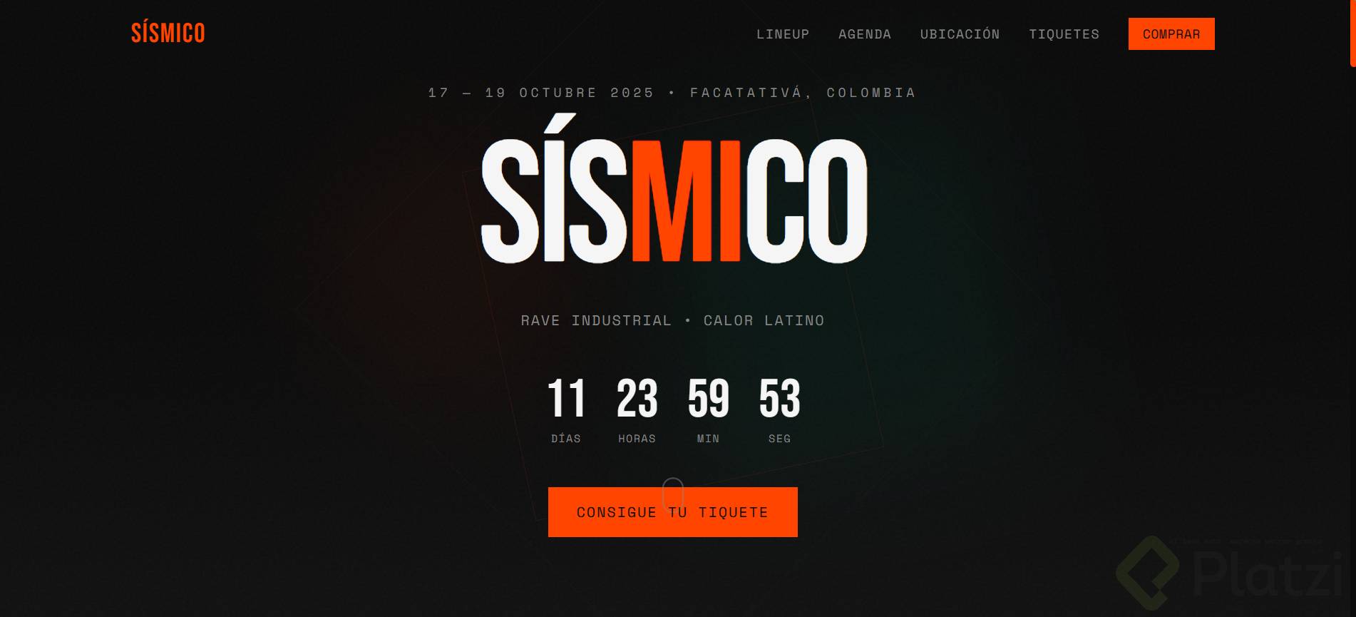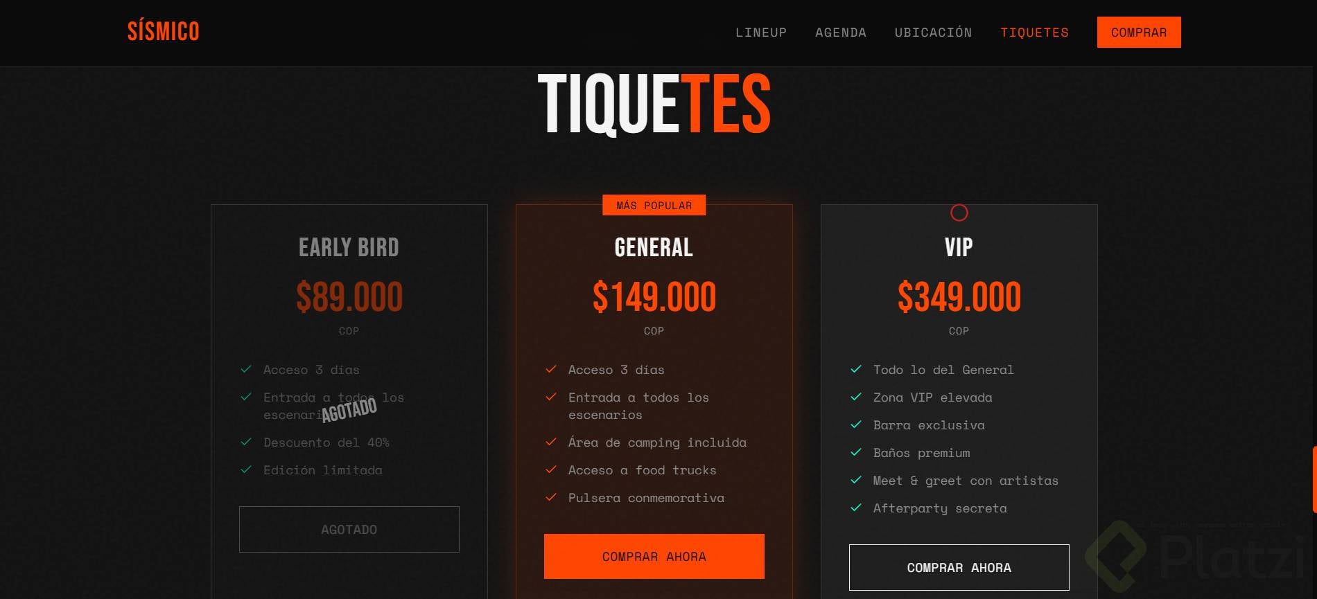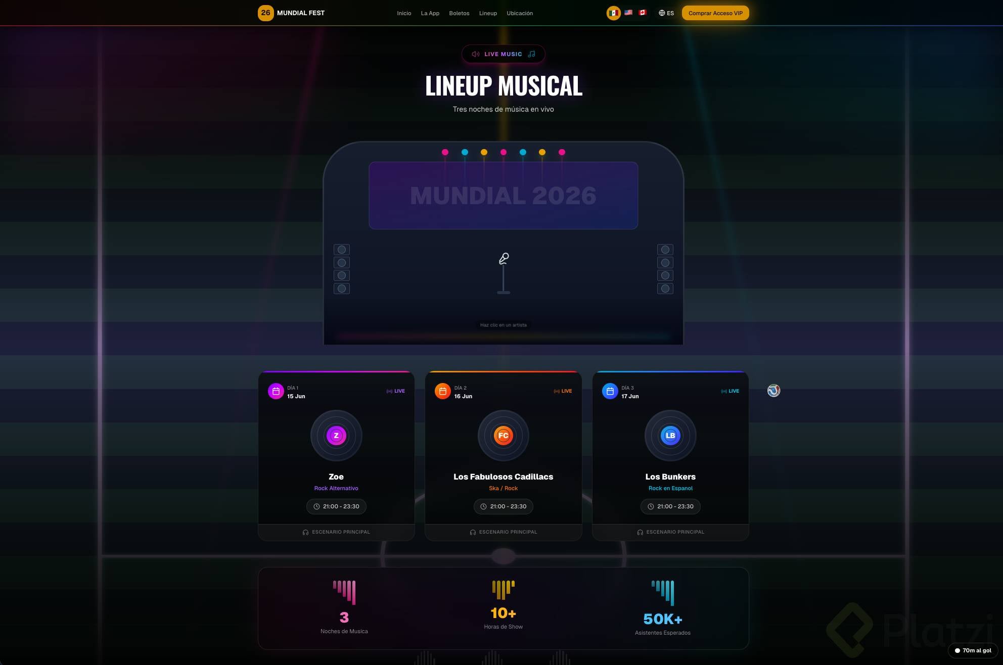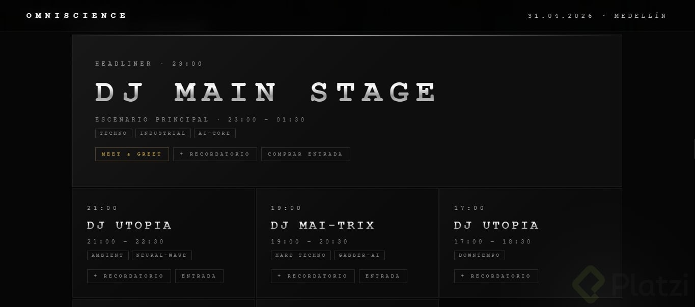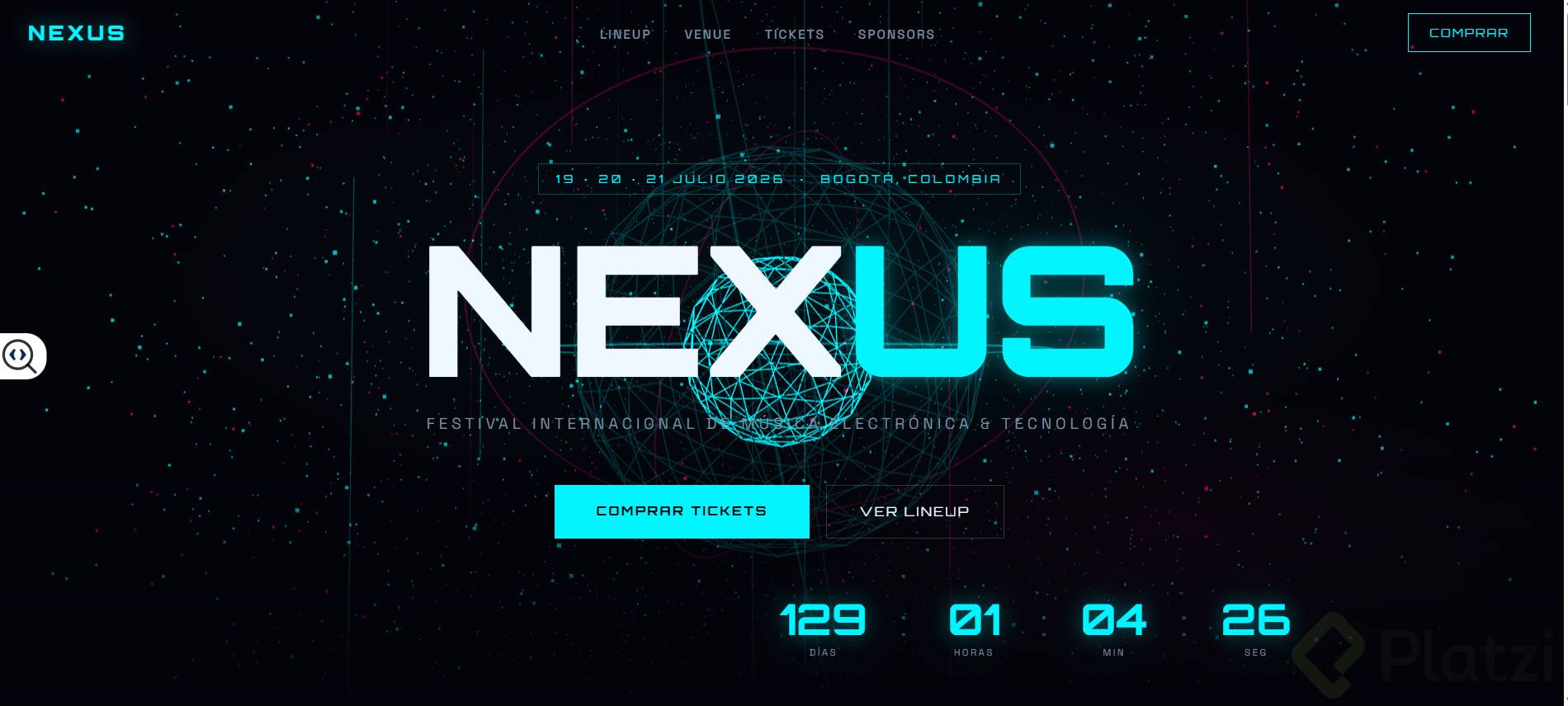 - Al menos 3 secciones (lineup/agenda, ubicación, compra de tickets)