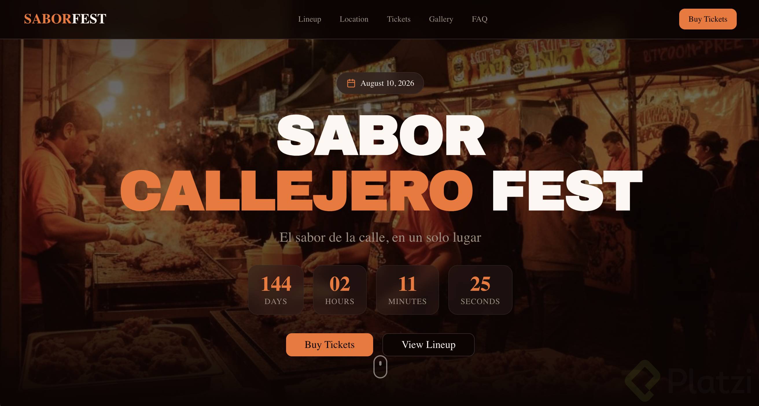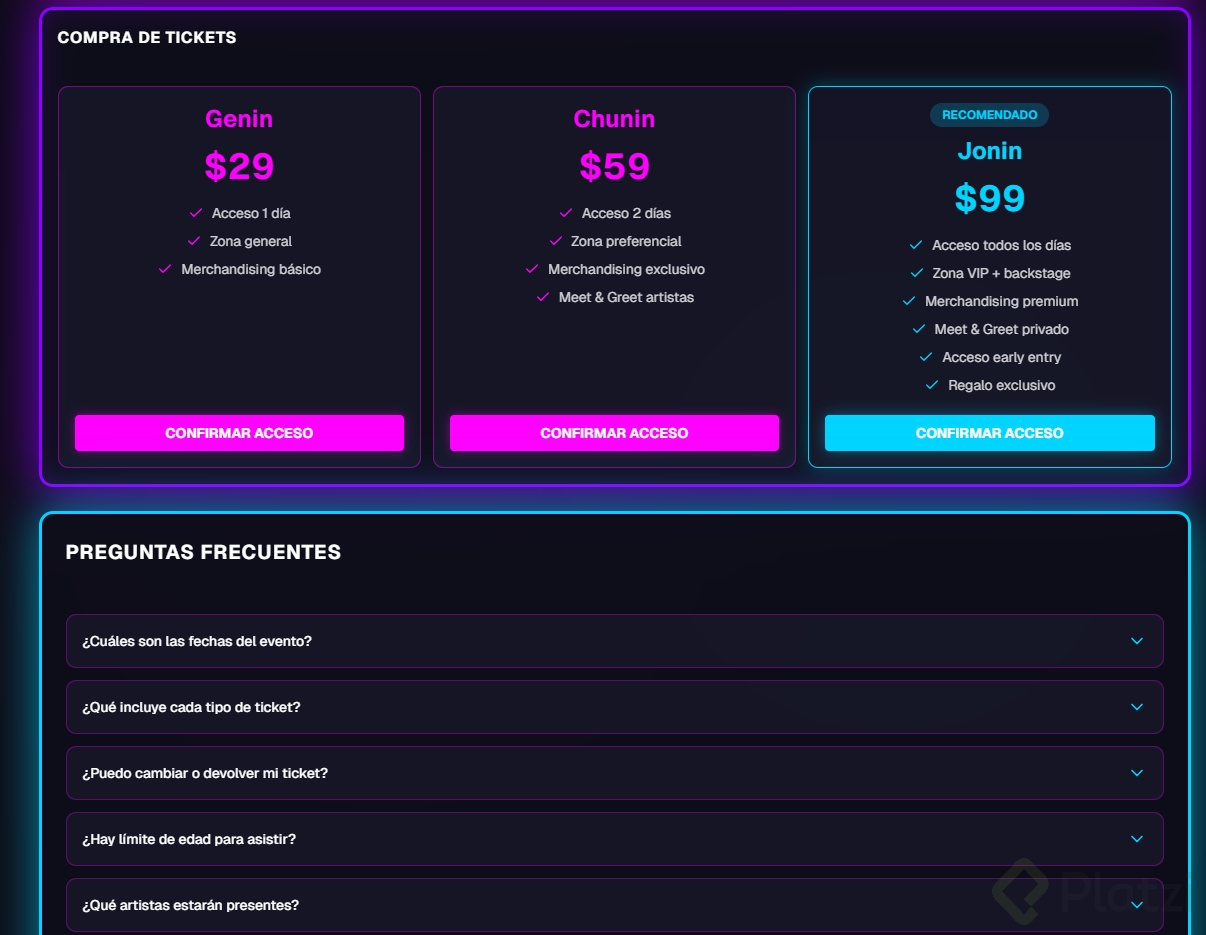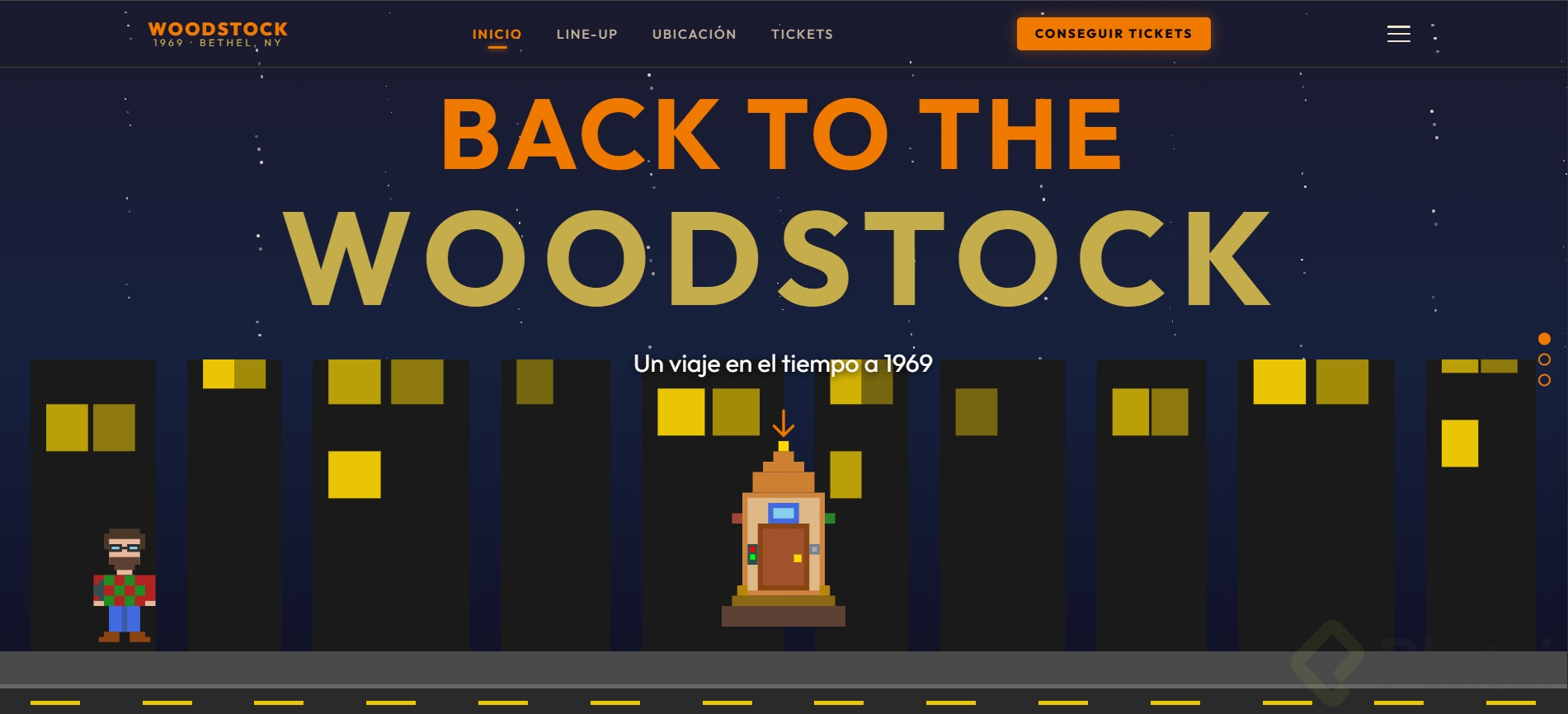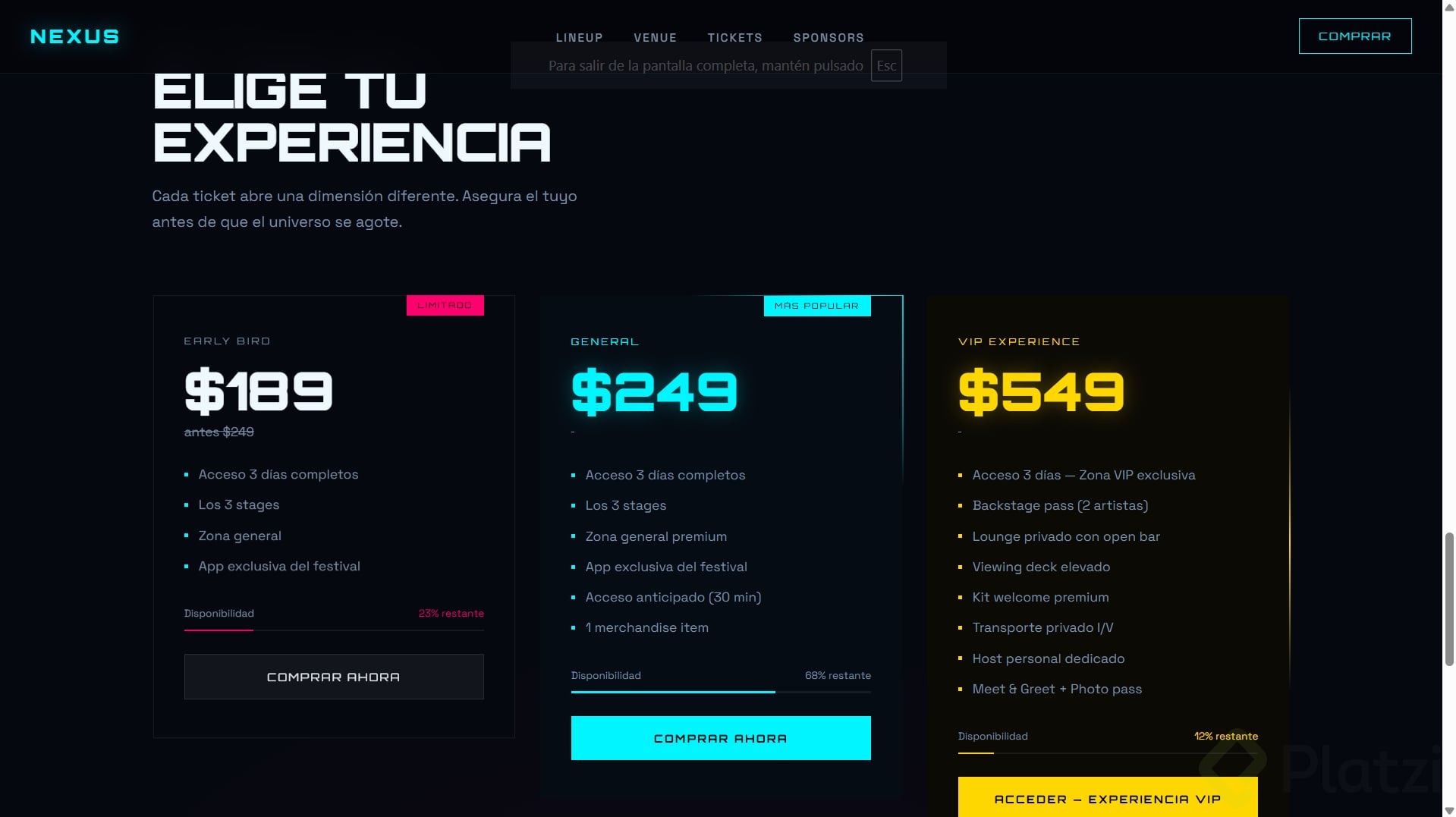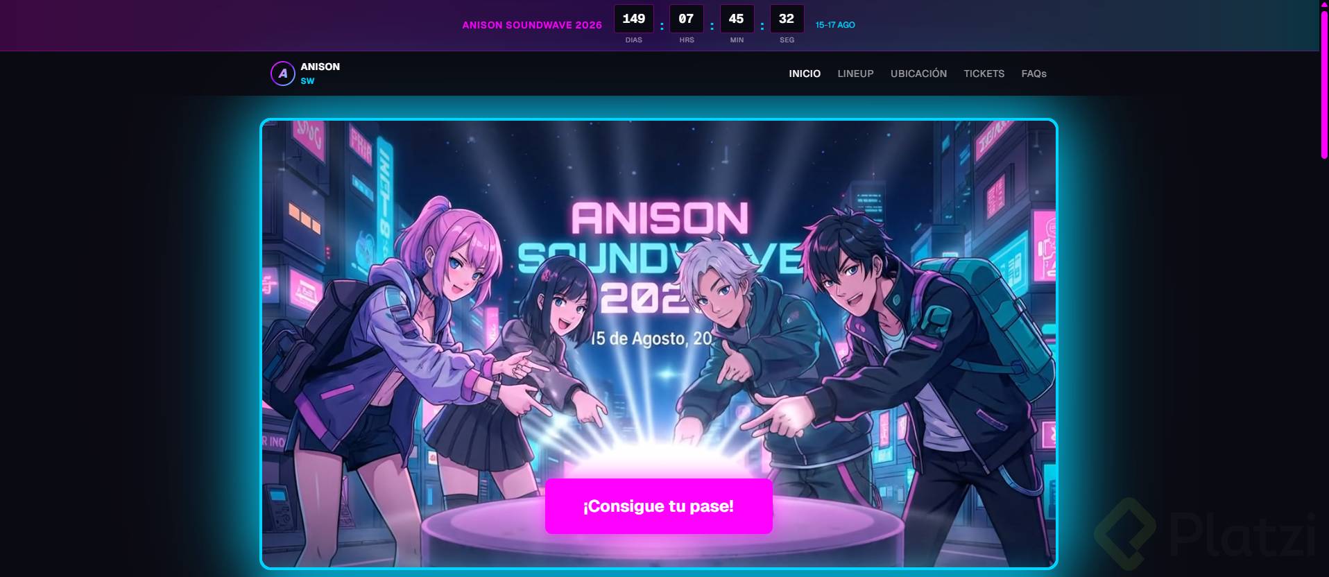 - Al menos 3 secciones (lineup/agenda, ubicación, compra de tickets)