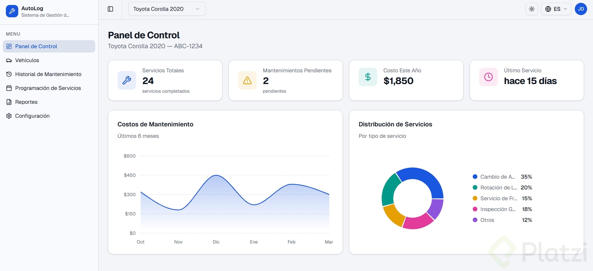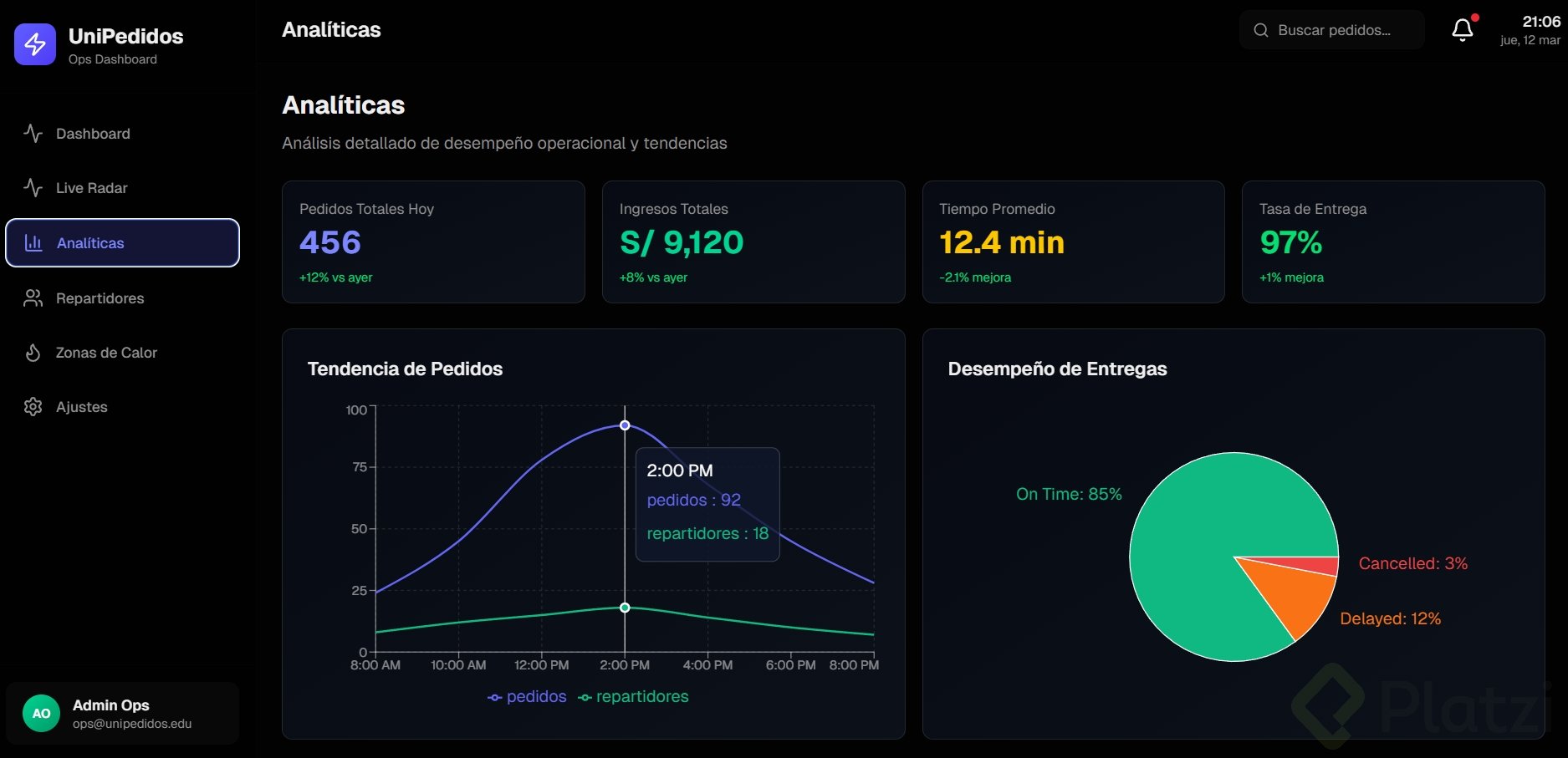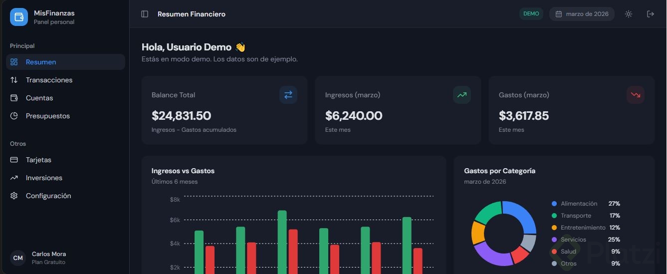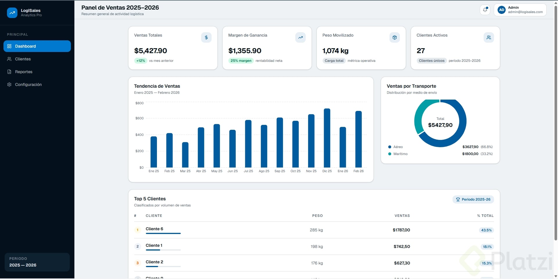 Debe tener al menos 3 tarjetas con datos, un gráfico o visualización, y navegación lateral o superior.