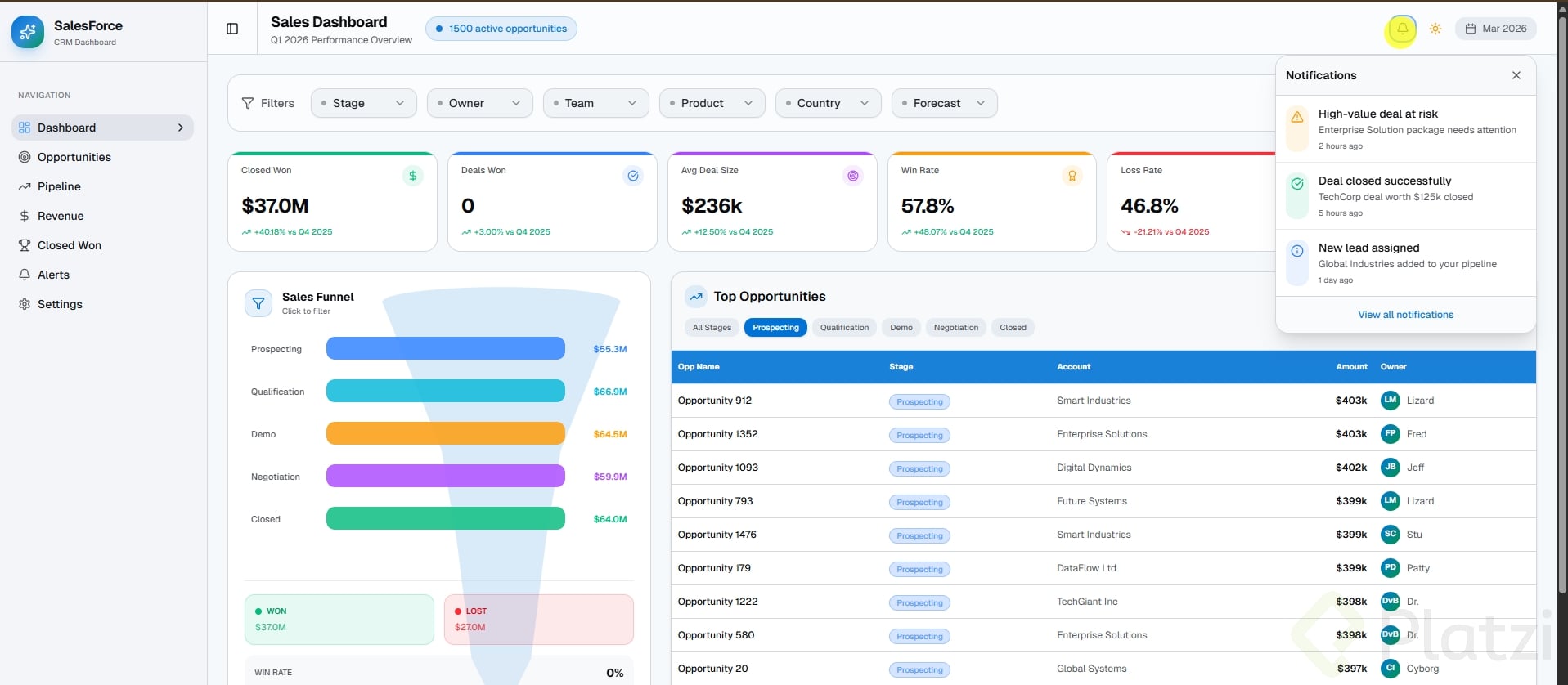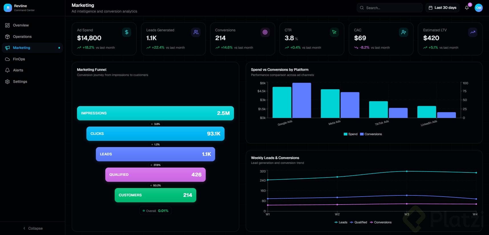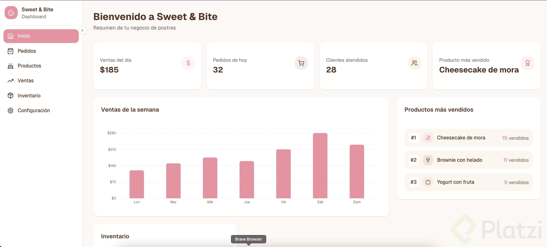 Debe tener al menos 3 tarjetas con datos, un gráfico o visualización, y navegación lateral o superior.