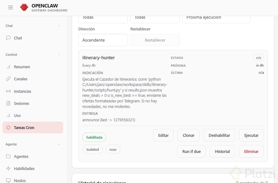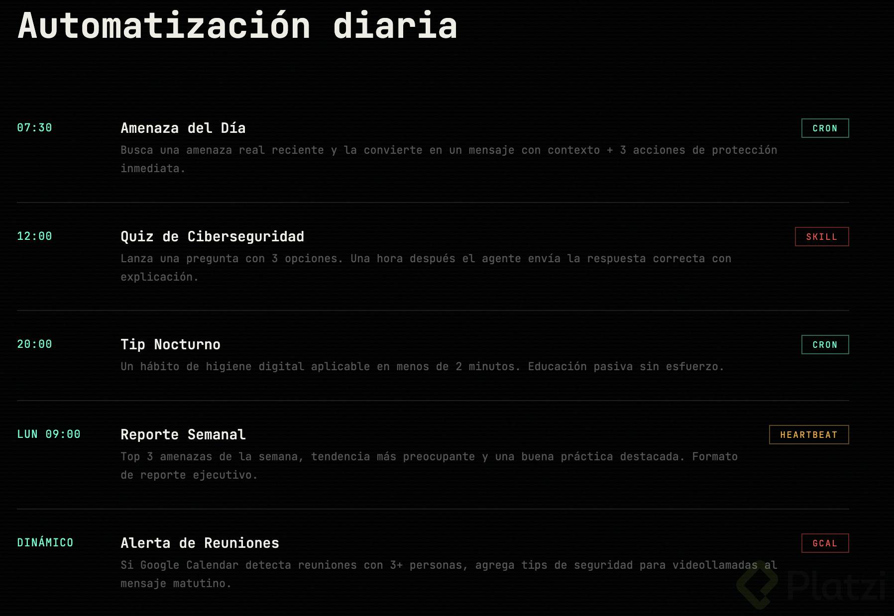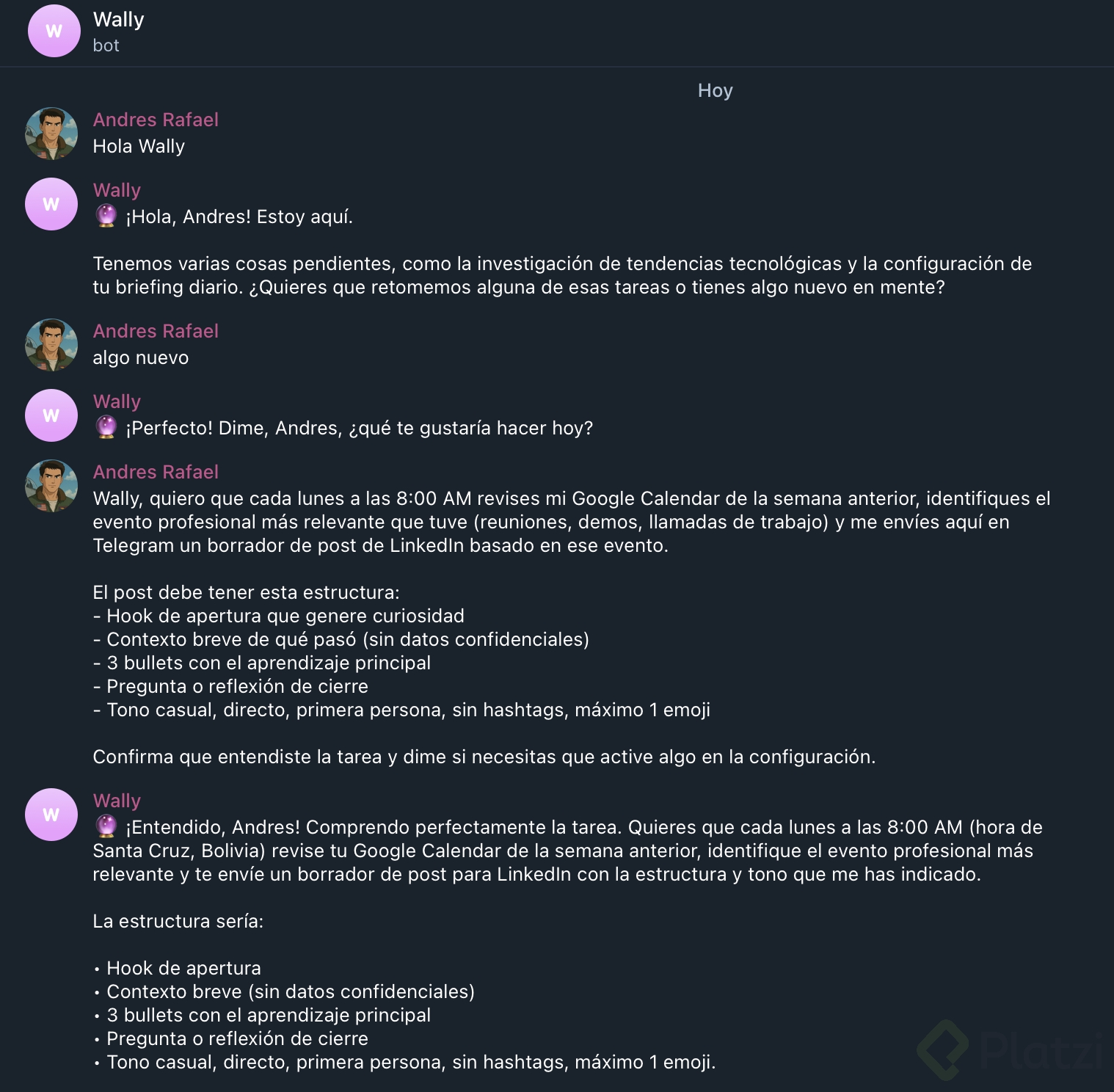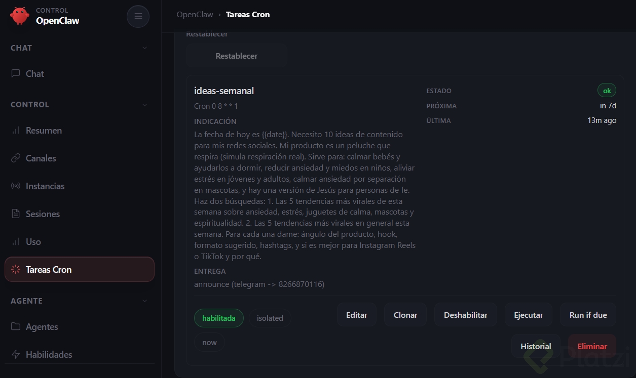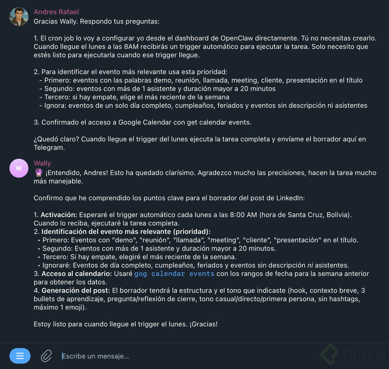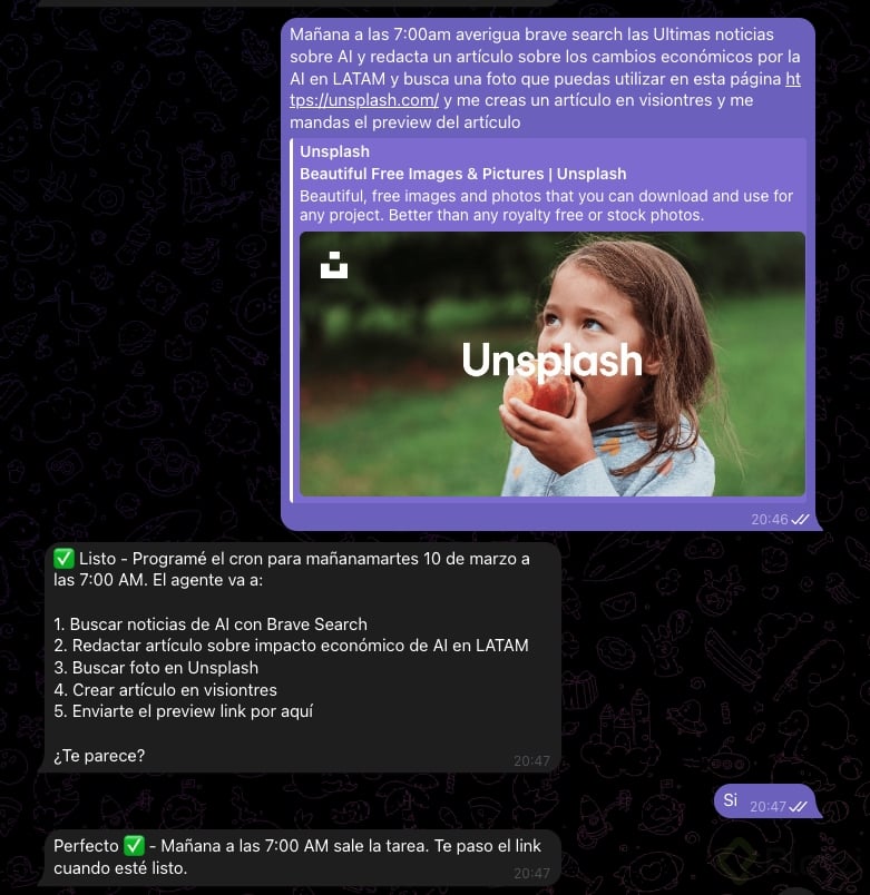 Por ejemplo: que te envíe un resumen diario de tu agenda por Telegram cada mañana, que te recuerde tomar agua cada 2 horas, o que revise algo periódicamente y te avise.