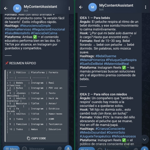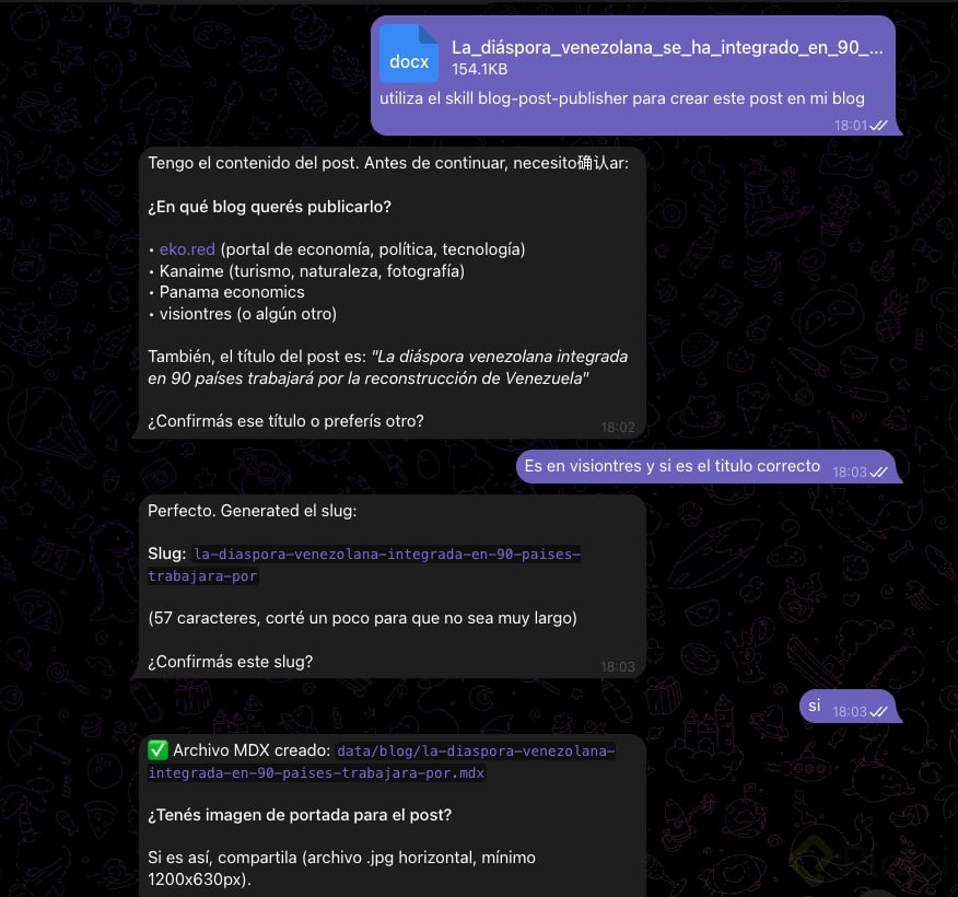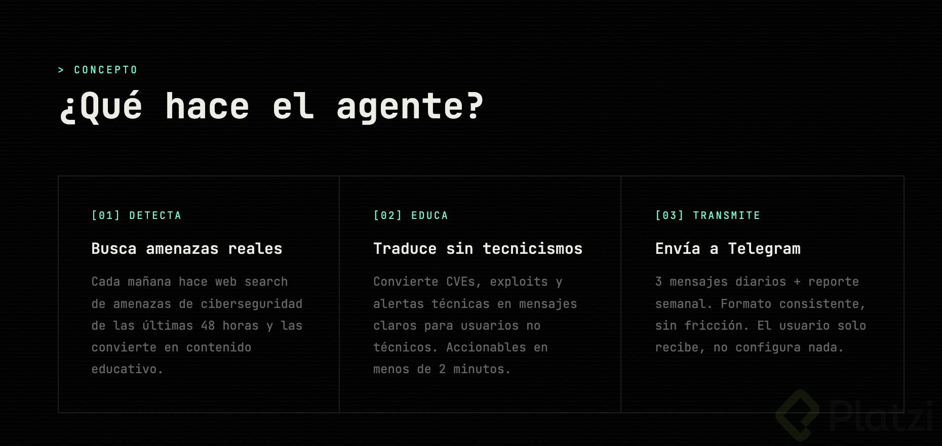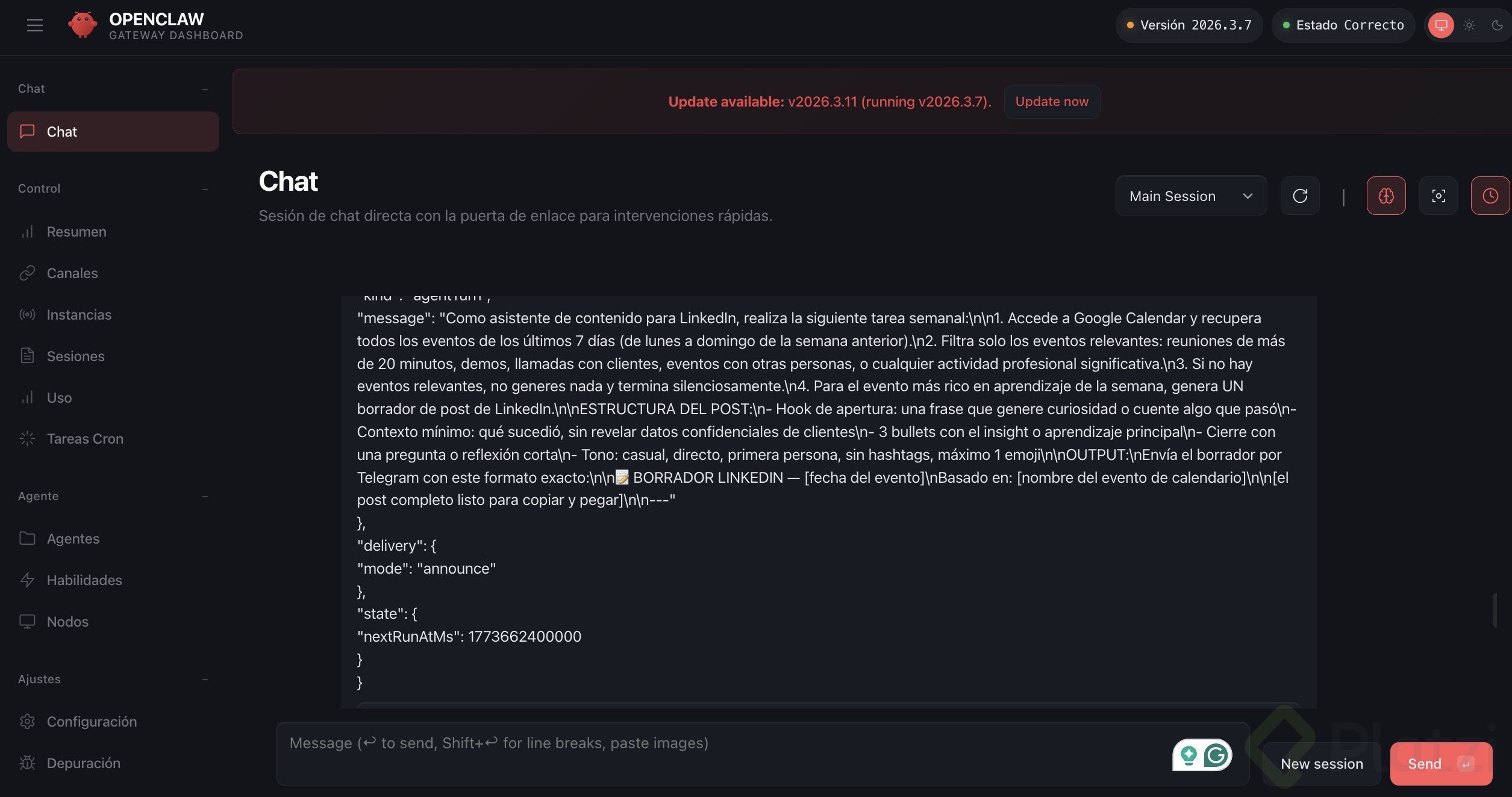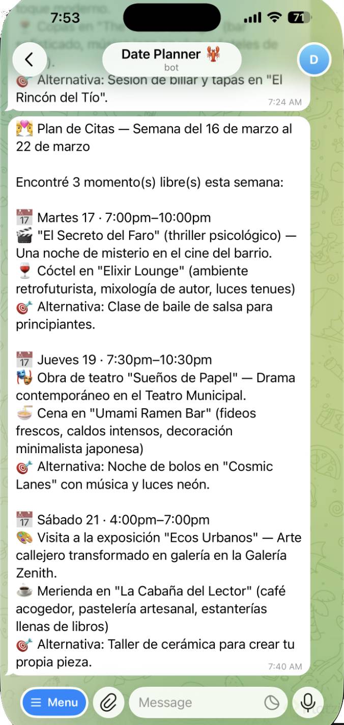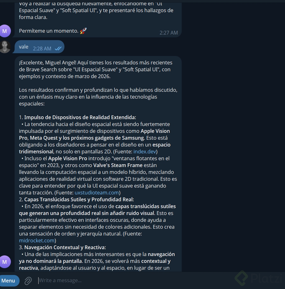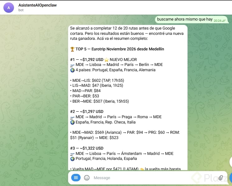 Por ejemplo: que te envíe un resumen diario de tu agenda por Telegram cada mañana, que te recuerde tomar agua cada 2 horas, o que revise algo periódicamente y te avise.