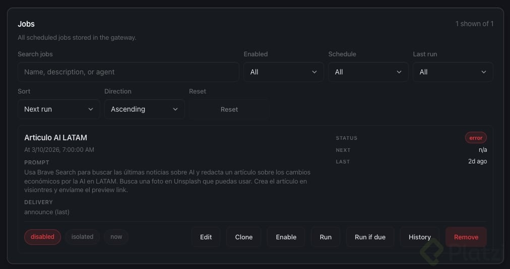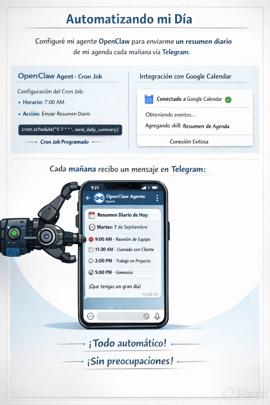 Configura tu agente de OpenClaw para que automatice algo que haces repetitivamente. Usa cron jobs, heartbeats, skills o la integración con Google Calendar para que tu agente haga algo útil sin que tú se lo pidas cada vez.
