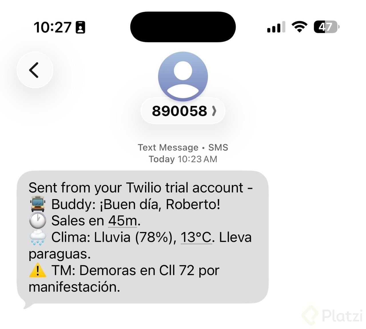 Hace un POST a la API de Twilio con autenticación Basic usando el Account SID y Auth Token. El cuerpo del mensaje se construye dinámicamente en Make con expresiones condicionales: si hay lluvia muestra el porcentaje y la temperatura, si hay tweets de TransMilenio muestra el texto del primero. El mensaje llega como SMS al celular en menos de 10 segundos.