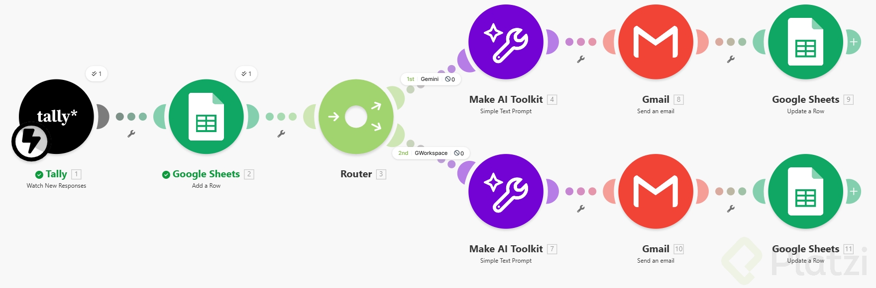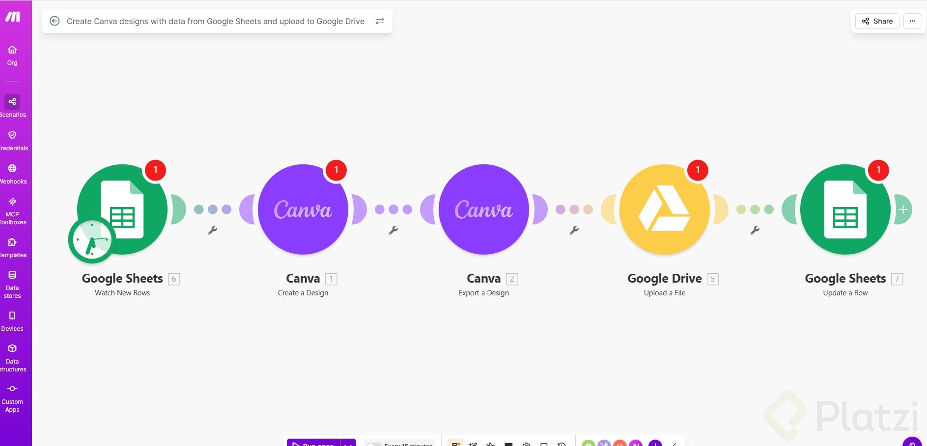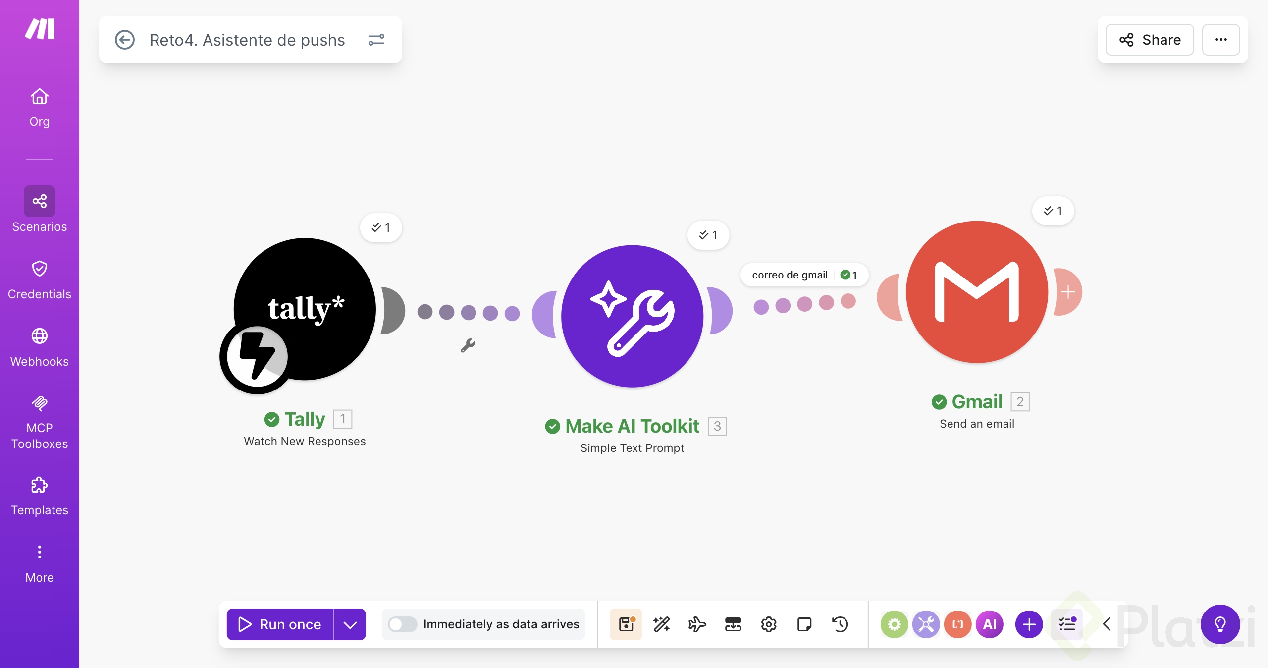 Todo el escenario vive en Make. Sin servidores. Sin código deployado. Sin infraestructura que mantener.