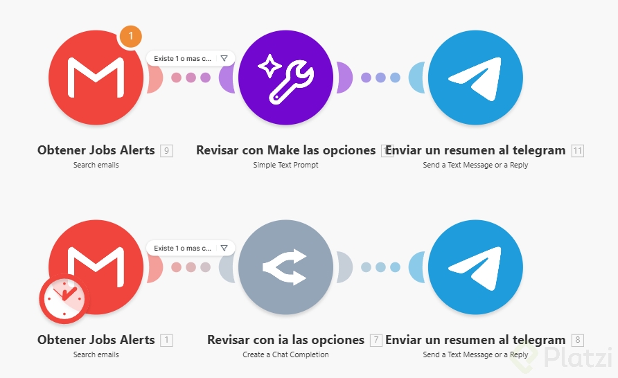 Aquí está el núcleo de la automatización. Make evalúa cuatro condiciones en OR: