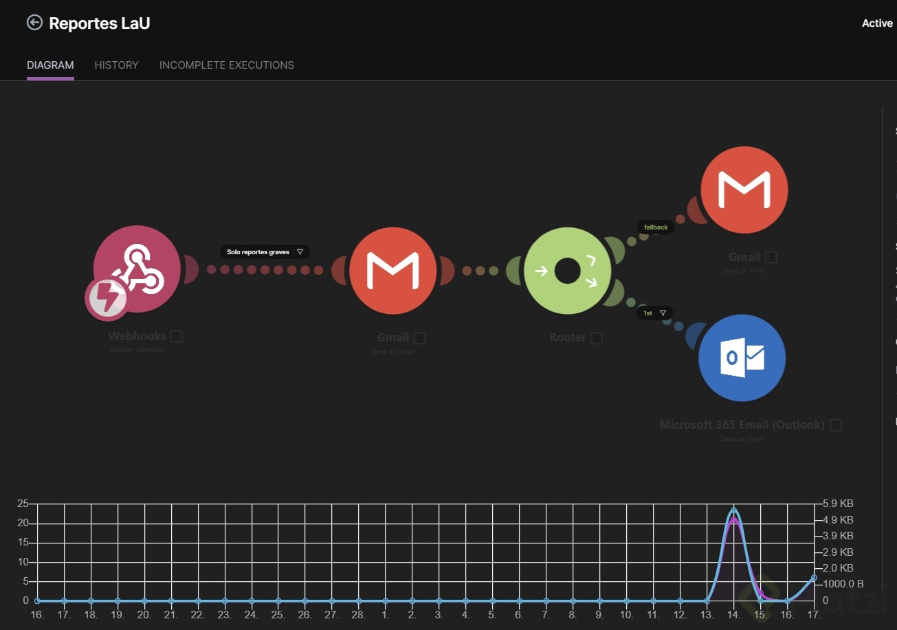 Si al menos una se cumple, el Router activa la ruta de producción y ejecuta el módulo Twilio.