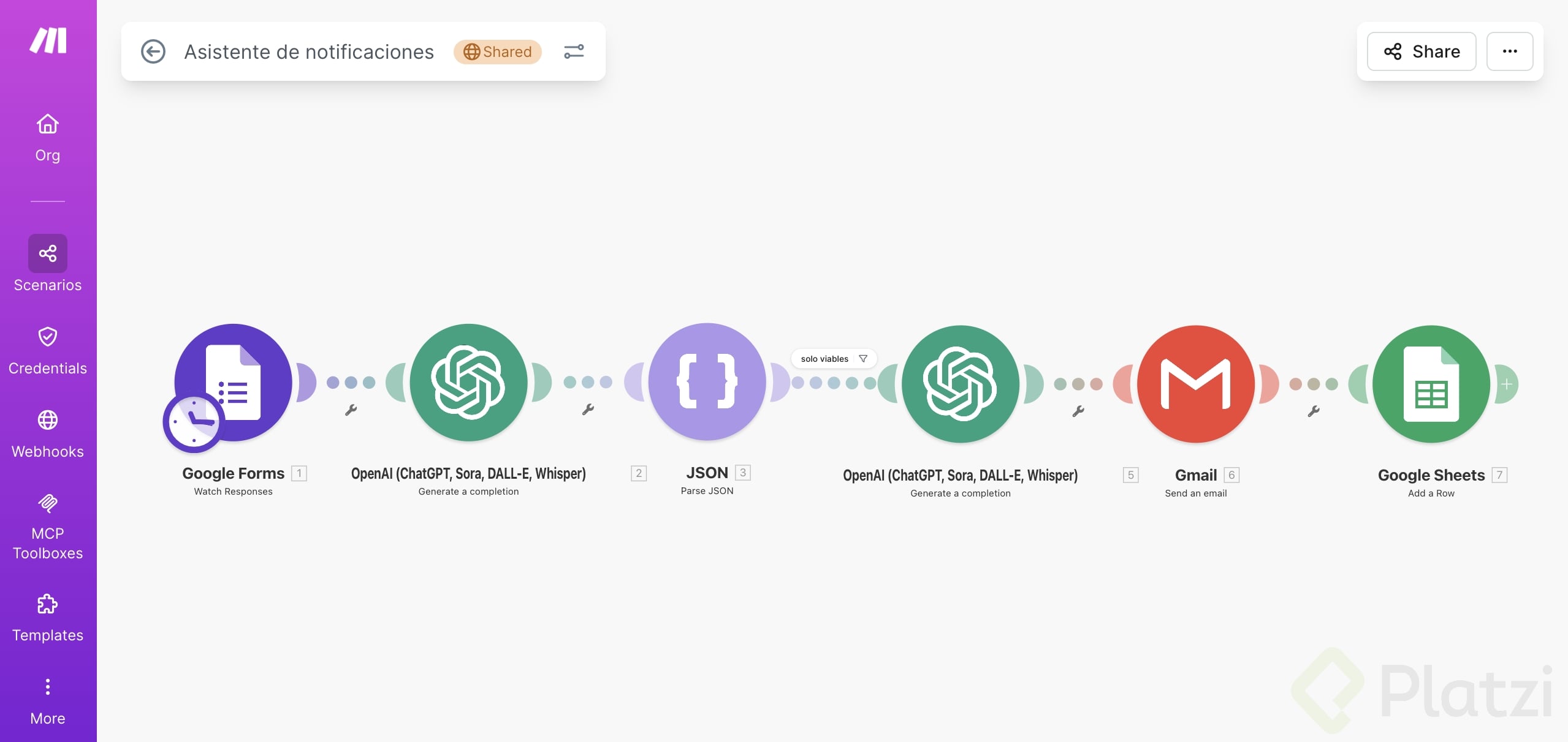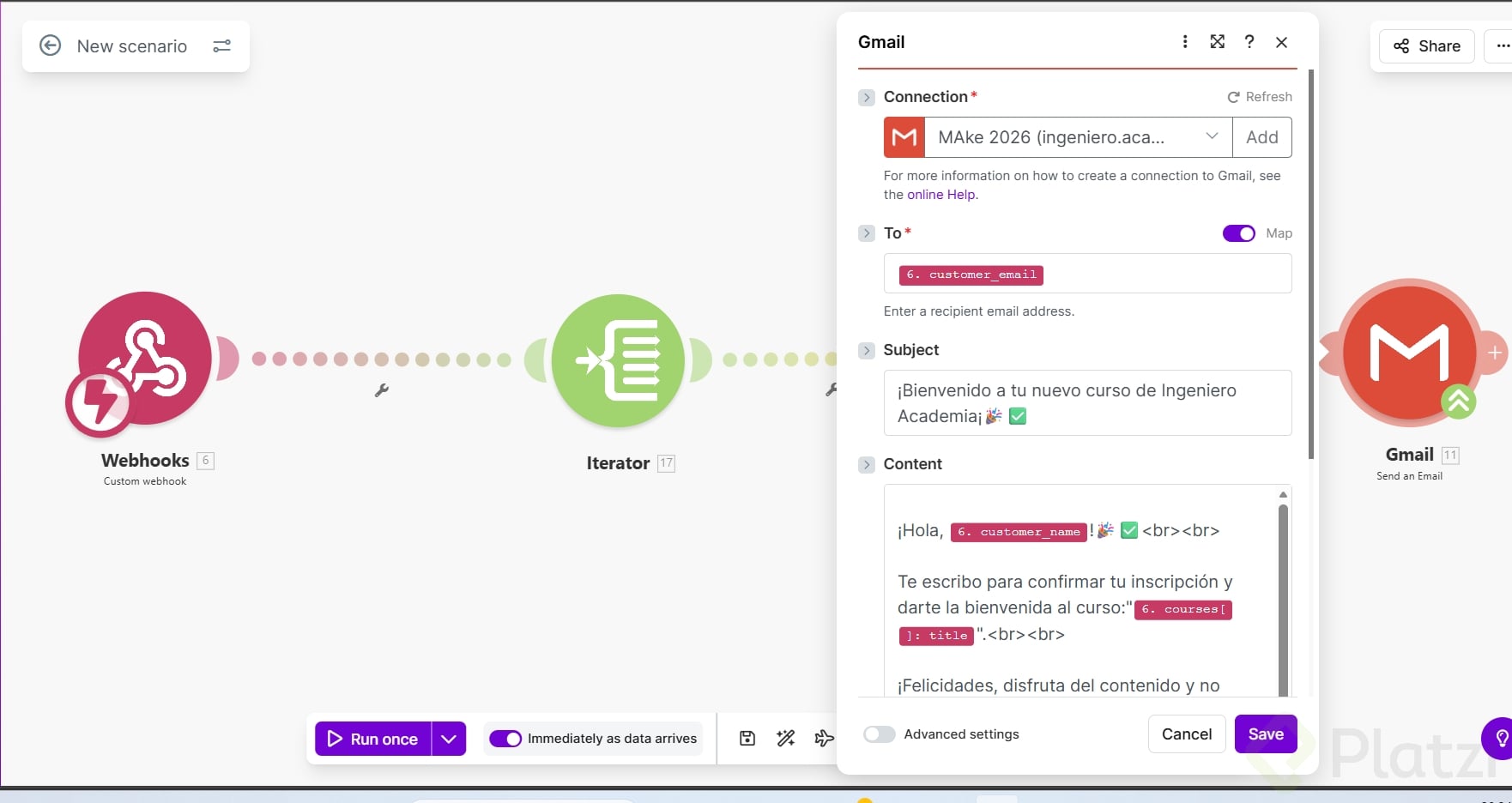 Por ser estudiante Platzi, si terminas pasas el examen del curso de Make y te certificas, recibirás por correo 6 meses de Make Core, uno de los planes más avanzados que le permite al usuario 150,000 operaciones por mes.