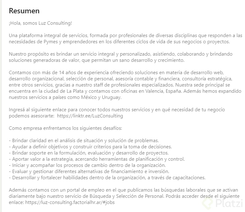 Evalúa cómo se estructuran estas descripciones, las acopla a tu necesidad, y optimiza estratégicamente el perfil empresarial en LinkedIn. Tu siguiente misión es aplicar estos consejos y optimizar tu perfil, brindando así la oportunidad de recibir feedback y mejorar continuamente. ¡El aprendizaje nunca se detiene y cada paso optimizado te lleva más cerca al éxito profesional!