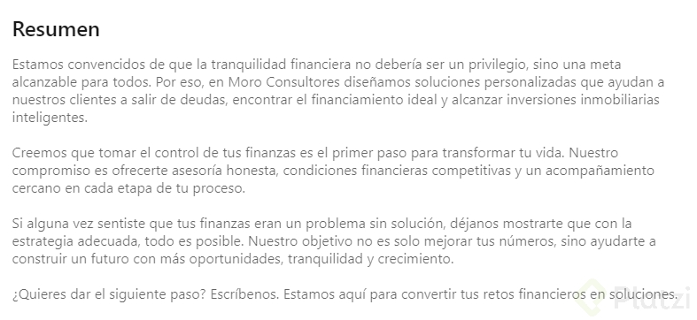 La descripción es donde puedes destacar la historia y las características únicas de tu empresa. Es el espacio para mostrar quién eres y qué ofreces al mundo. Aprovecha para incluir una narrativa atractiva que despierte el interés de tus lectores: