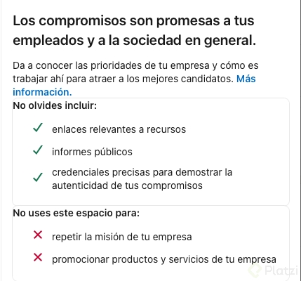 Los compromisos son promesas que haces a tus empleados y al mundo. Estos pueden motivar a personas talentosas a unirse a tu equipo. Inclúyelos si tu objetivo es atraer talento, destacando aspectos como: