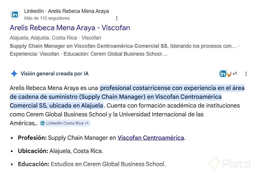Un caso conocido es el de Maca Arriba. En Google, aparece su nombre completo “Macarena Arriba”, un resumen por IA, artículos y redes. Su tercer resultado es LinkedIn, donde resalta su marca personal profesional: el banner apunta a finanzas y negocios, y se apalanca de un rasgo distintivo, “Café en mano por Maca Arriba”. Su headline explica con claridad: “Te ayudo a entender las empresas que dominan al mundo”, y destaca su rol como co-host del podcast “Chisme Corporativo”. Clave: autenticidad. Incluso sin la sección About, el resto de su perfil la hace destacar.