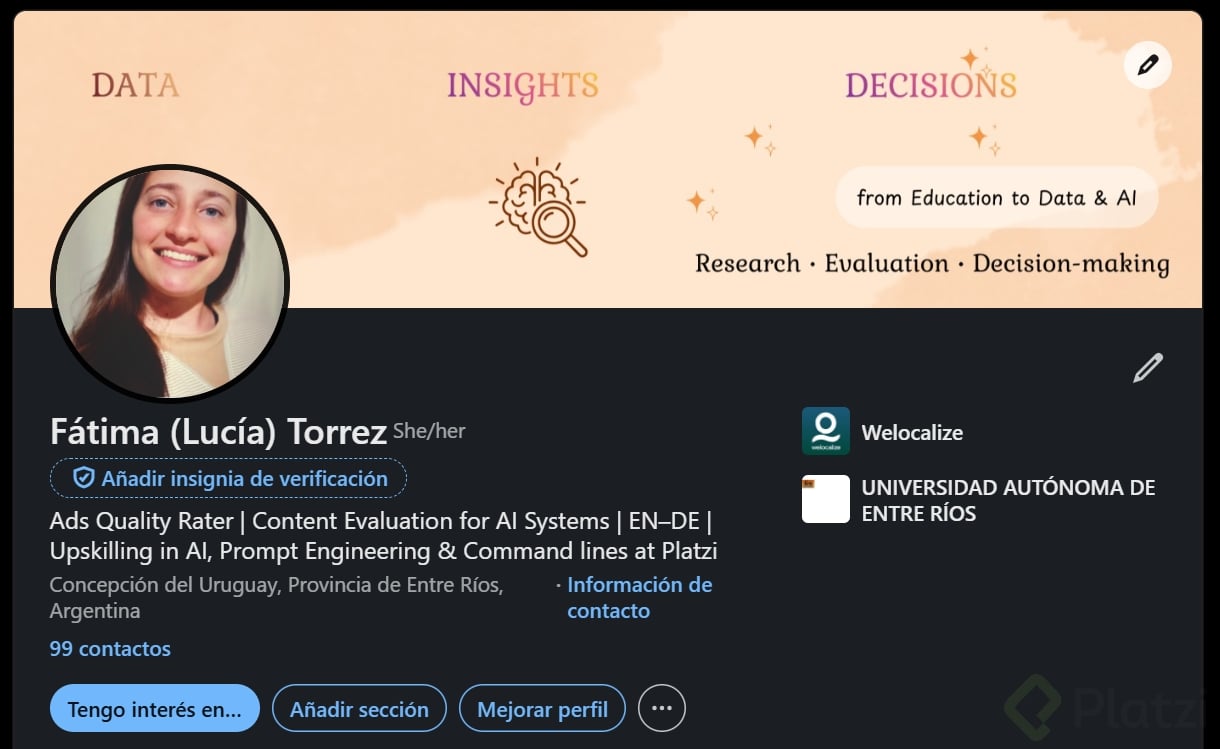 - No repitas tu nombre en el centro. LinkedIn ya lo muestra en el perfil. Usa ese espacio para decir qué haces.