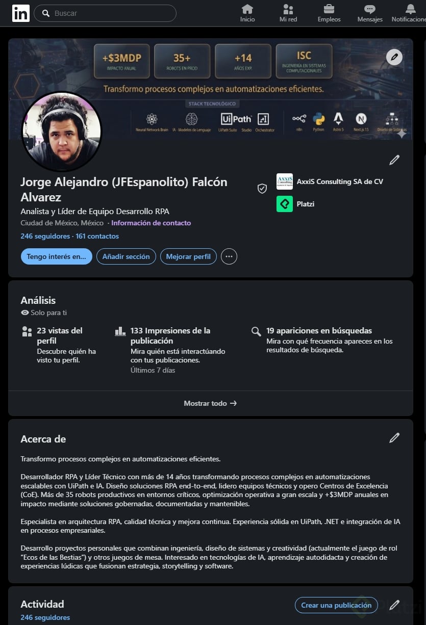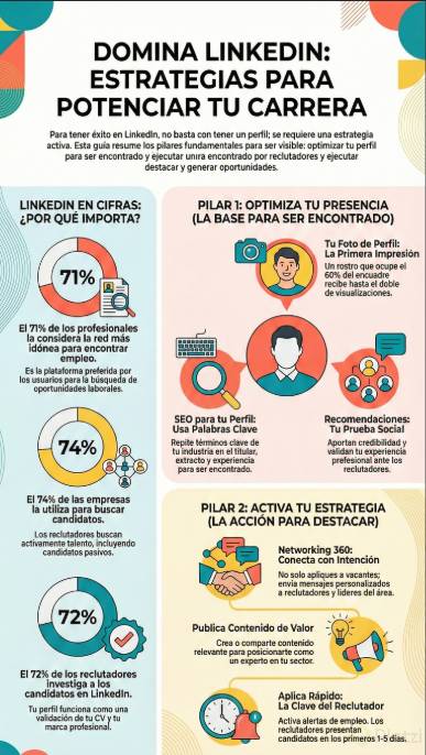 - Optimización de perfil: fotografía, banner, impacto inicial, experiencia, presentación y crecimiento de red.