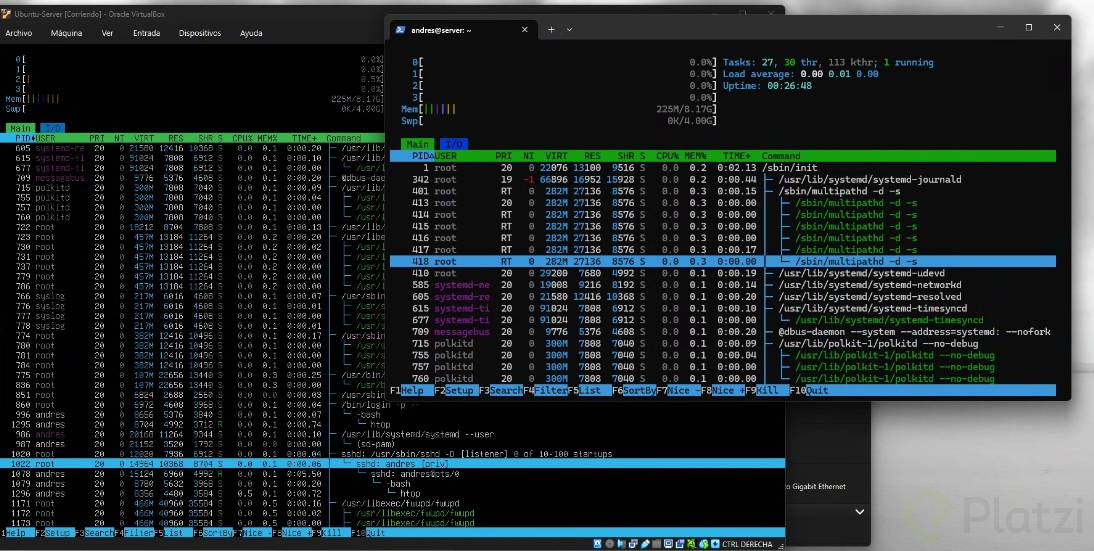 Permite buscar procesos (usando F3), ajustar su prioridad (niceness) y ver un árbol de procesos (F5). Para modificar el niceness se necesita ser root: