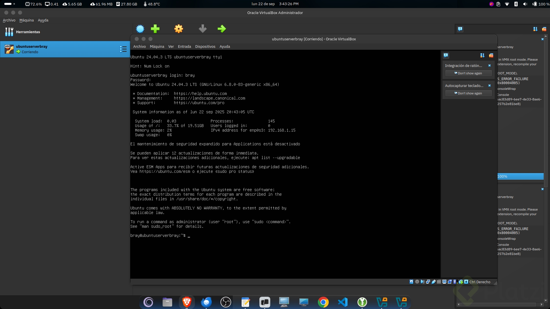 Una vez completada la instalación, reinicia la máquina virtual. Si aparece un mensaje solicitando la expulsión del medio de instalación, simplemente verifica que la imagen ISO ya no está conectada.