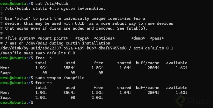 /etc/fstabpara asegurar que el swap se active al arrancar el sistema:sudo vim /etc/fstab - Añade la línea: