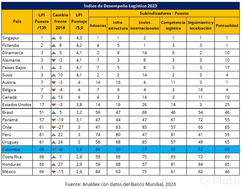 Los países europeos dominan en competitividad logística, encabezados por Alemania con una calificación de 4.20. Este alto rendimiento es impulsado por sólidas infraestructuras logísticas en Europa. En comparación, Latinoamérica queda rezagada, con su mejor exponente siendo Chile, que aún así solo obtiene una puntuación de 3.32. Países como Panamá, México, Brasil, y Colombia siguen en la lista, pero aún enfrentan desafíos significativos para alcanzar estándares globales.