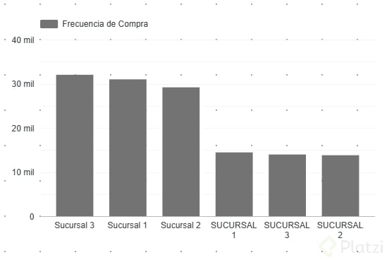 - Crear un gráfico de barras con "Sucursal" como dimensión y "Frecuencia de compra" como métrica