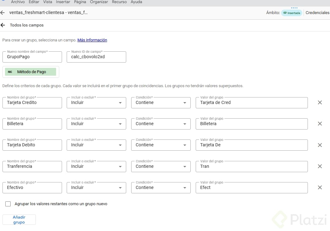 Es importante seleccionar cuidadosamente los campos que se incluirán en la combinación, considerando tanto dimensiones (categorías) como métricas (valores numéricos) que serán útiles para el análisis.