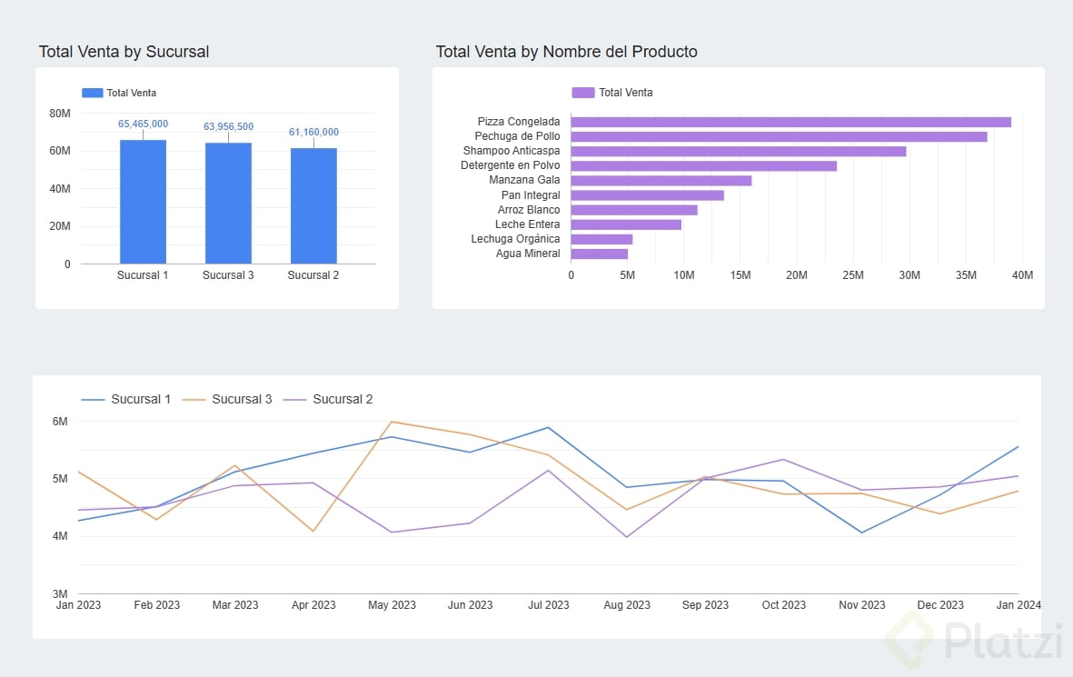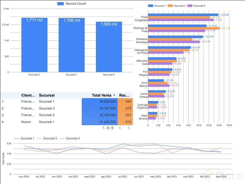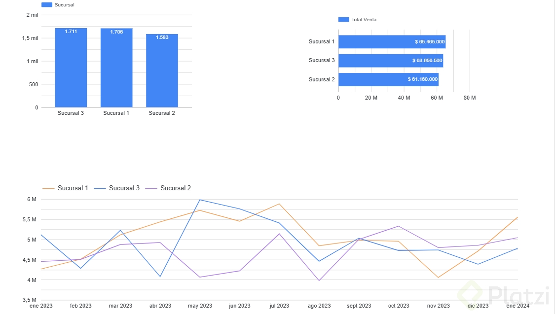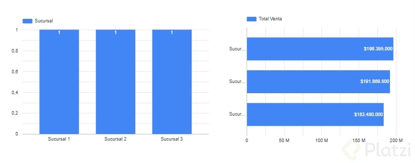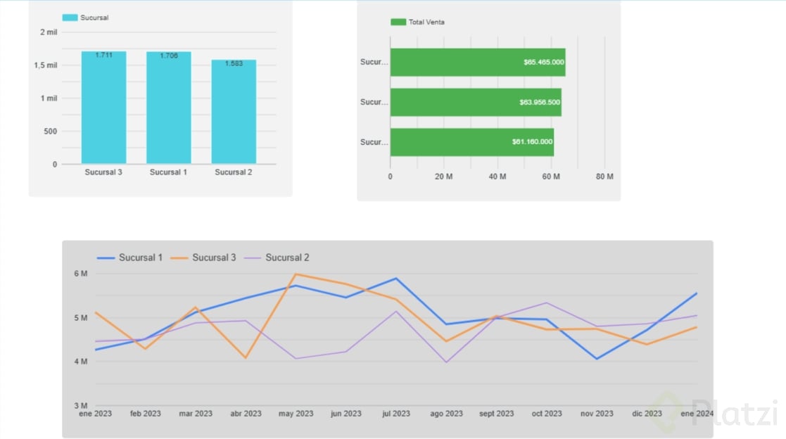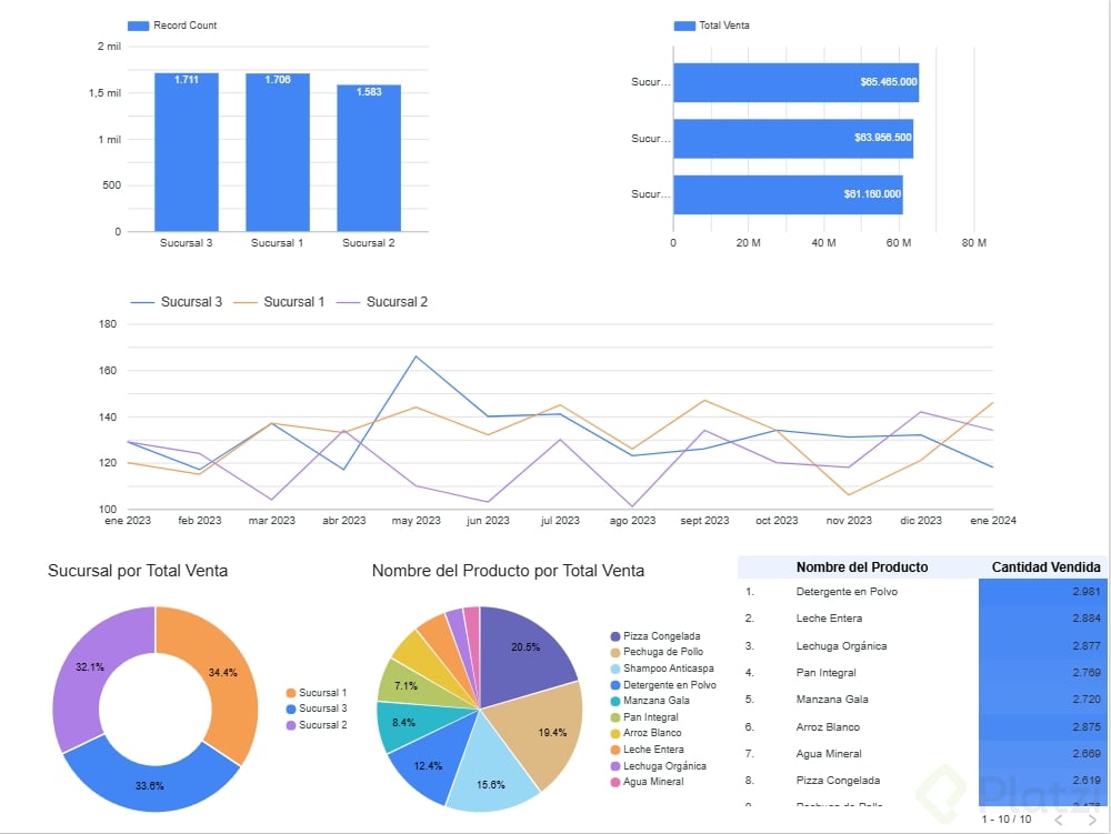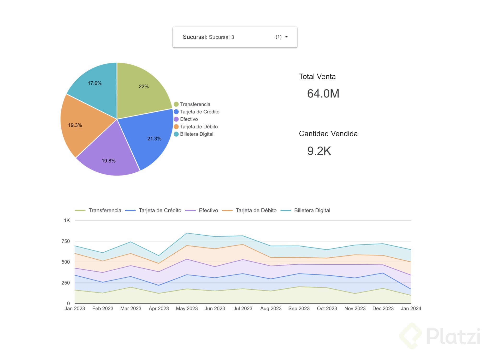 - Utiliza la opción "dimensión de desglose" con "sucursal" para separar visualmente las líneas correspondientes y analizar tendencias individuales de cada sucursal.